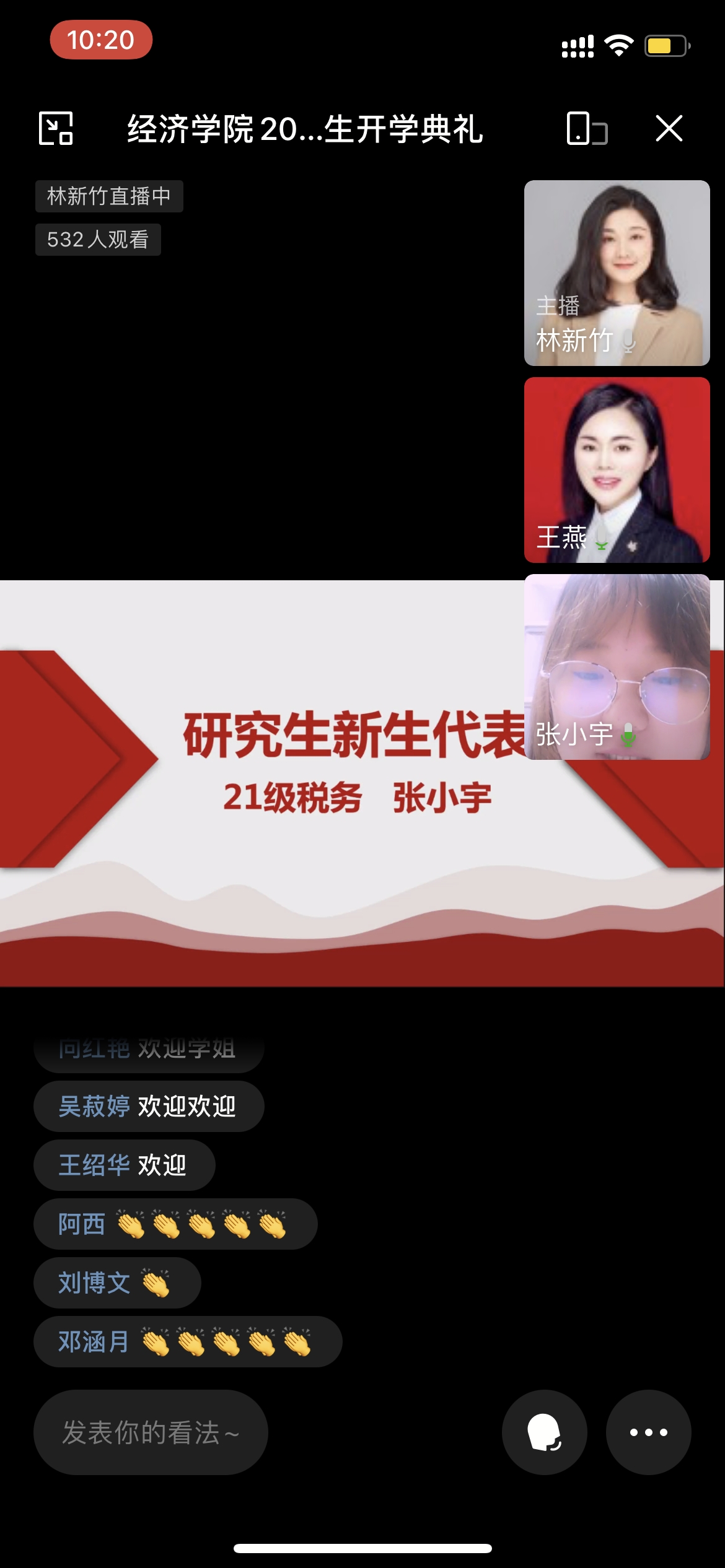 第三项议程高年级学生代表和新生代表进行交流。本科学生代表19级国贸一班左茜雅同学、研究生新生代表21级税务专业的张小宇先后发言。其中左茜雅同学分享了自己在太阳成集团tyc122cc的学习感悟,希望学弟学妹们珍惜大学时光,抓住每一个机会,深入学习专业知识,积极参加各类实践,提高自主性和创新性,把握机会向师者学习,成为兼顾学识和素质的高质量人才;而21级税务专业研究生的张小宇同学,则代表研究生新同学,从学习态度、课程学习、专业理论研究等层面表达了未来刻苦学习的决心,希望未来能够跟学姐学长好好学习,不辜负三年的研究生美好学习时光,努力成为祖国的栋梁之才。