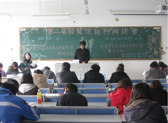 3月27日下午1:30 主校区70405 教室内热闹非凡,由经贸学院团委学生会主办、经贸学院团委学科部承办的第二届经贸论坛杯辩论赛激情上演,比赛特邀管理学院辩论队队长乔冲,会计学院陈俊杰、唐韦仪担任评委,同时此次比赛也吸引了众多大二、大三的同学前来观看。