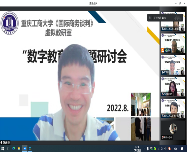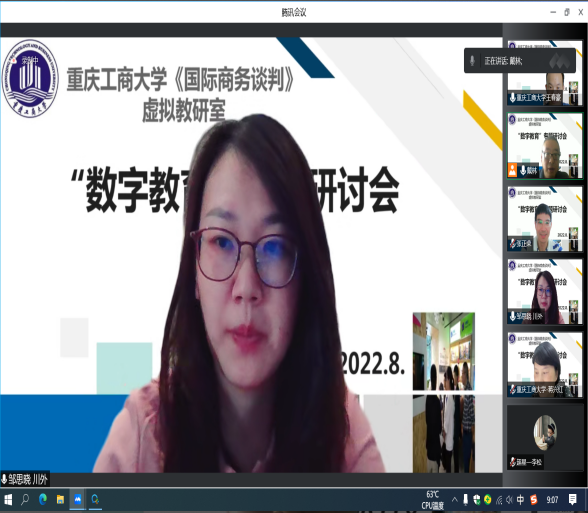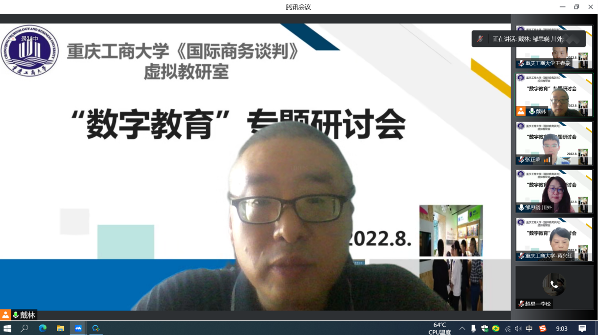 2022年8月19日,122cc太阳集成游戏校级虚拟教研室,《国际商务谈判》虚拟教研室“2022数字教育专题研讨会”在腾讯会议平台成功举办,会议由教研室负责人戴林副教授主持,校外成员浙江理工大学管理学院跨境电子商务研究所所长张正荣、四川外国语大学国际金融与贸易学院国际经济与贸易系主任邹思晓以及校内成员蒋兴红、王春豪、冉梨等老师参加了会议,特邀超星公司李松、张秋林和刘文静老师参加研讨。