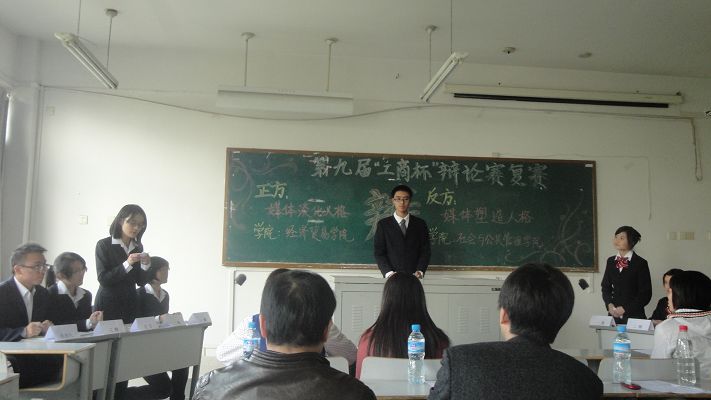 口才之能尽在辩析,智慧之风尽在评论.11月5日下午3点,第九届“工商杯”辩论赛复赛在主校07410教室热烈开辩.本次复赛由校团委主办,由我院作为正方与社管学院就“媒体淡化人格”和“媒体塑造人格”展开一场精彩的唇枪舌剑.