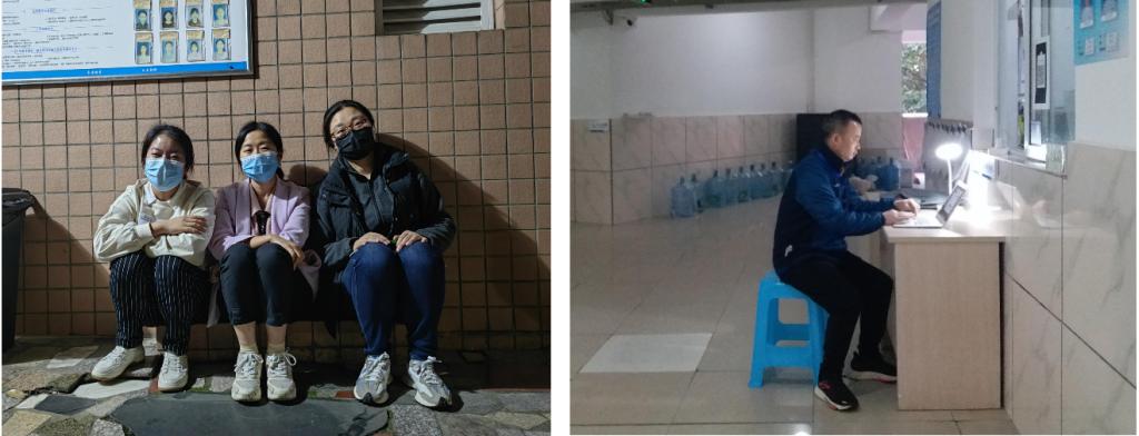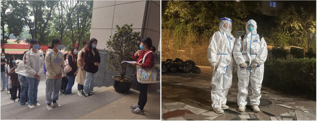 在忙碌之余,辅导员们通过手机及时查看回复学生消息,关心着同学们的网课学习情况、思想动态和心理状态,安抚和疏导同学们的情绪,传递关怀和温暖。为了不耽误考研同学的备考进度,辅导员们有序组织学生进图书馆取回书籍,帮助同学们解决燃眉之急。有同学生病发烧,辅导员邓雪霜立刻换上防护服,在深夜一路陪伴学生就医。无论清晨还是夜晚,学生公寓楼下都有辅导员们坚守的身影。他们是负责的老师,是贴心的朋友,是最温暖的守护者。