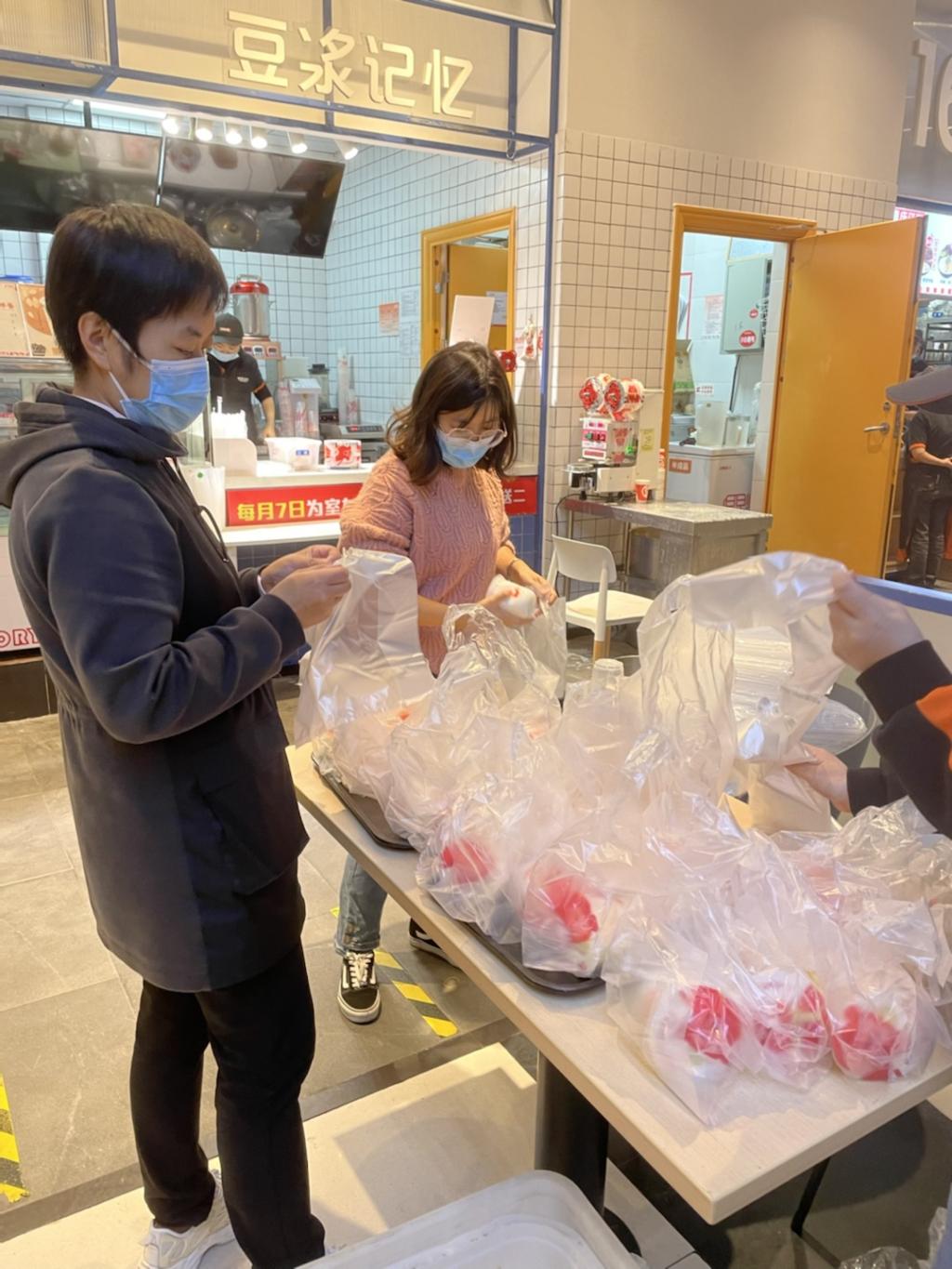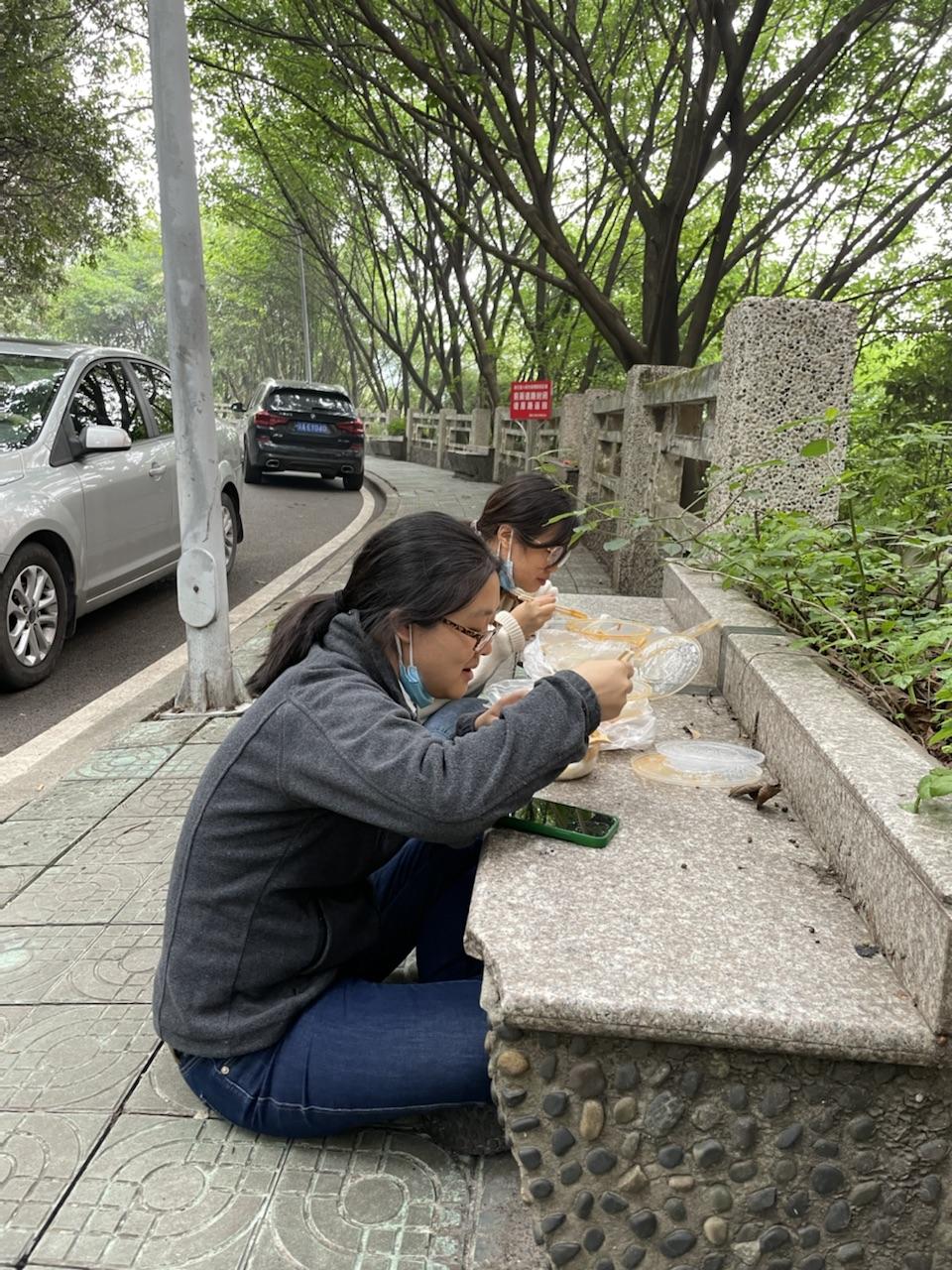 在每天的清晨、中午、傍晚,辅导员们奔走于食堂与学生寝室之间,忙碌在配餐送餐第一线。为了确保同学们能准时吃上热气腾腾的饭菜,辅导员们早早做好准备,配餐、打包、装箱、搬运、清点数量,以最快速度把食物送到学生宿舍楼栋。直到全部送餐工作结束,他们才到路边的石凳上草草用餐,然后急忙从“送餐员”变回辅导员,继续投入战斗。