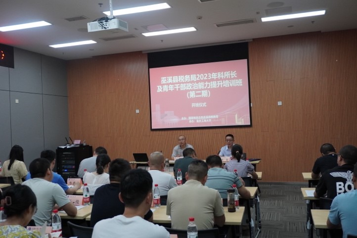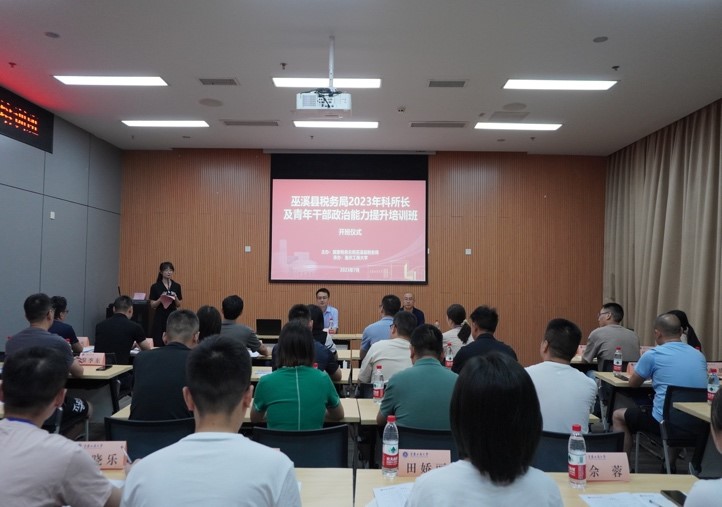 为适应新形势下税收高质量发展工作需要,全面贯彻落实“人才兴税”战略,打造一支政治、思想、能力、作风全面过硬的高素质干部队伍。由国家税务总局巫溪县税务局主办、122cc太阳集成游戏太阳成集团tyc122cc承办的两期“2023年科所长及青年干部政治能力提升培训班”分别于2023年7月23日——2023年7月29日、2023年7月30日——2023年8月5日在我校图书馆会议中心二会议室顺利举行。122cc太阳集成游戏党委常委、统战部常务副部长陈松出席开班仪式;国家税务总局巫溪县税务局党委书记、局长刘睿,国家税务总局巫溪县税务局党委委员、纪检组组长黄鑫分别出席两期开班仪式。国家税务总局巫溪县税务局82名科所长及青年干部参加此次培训。