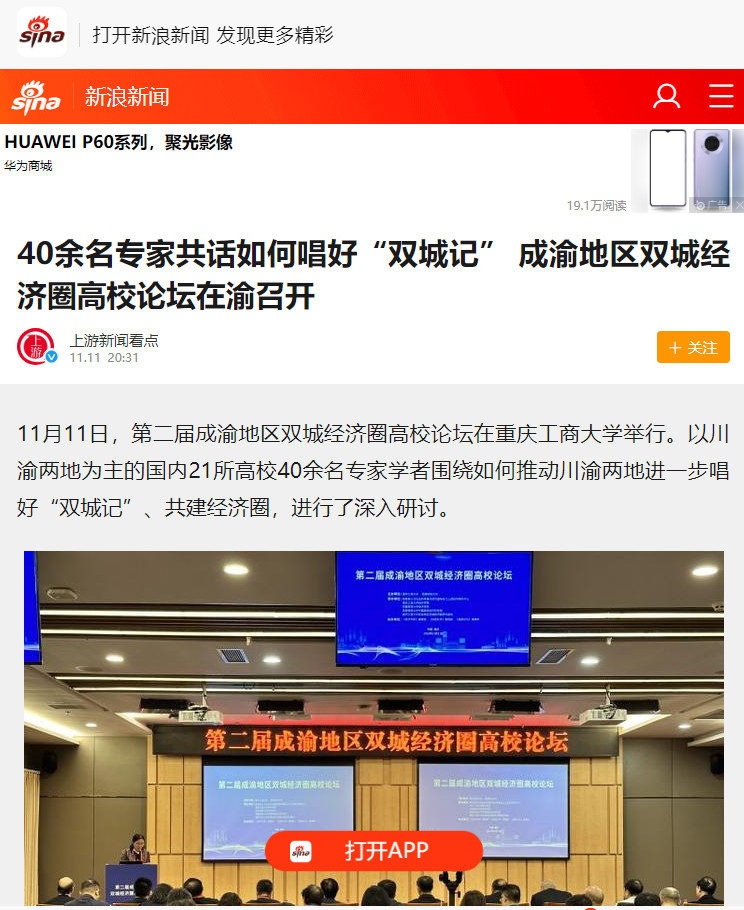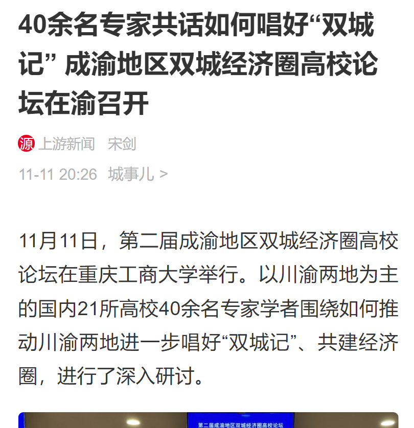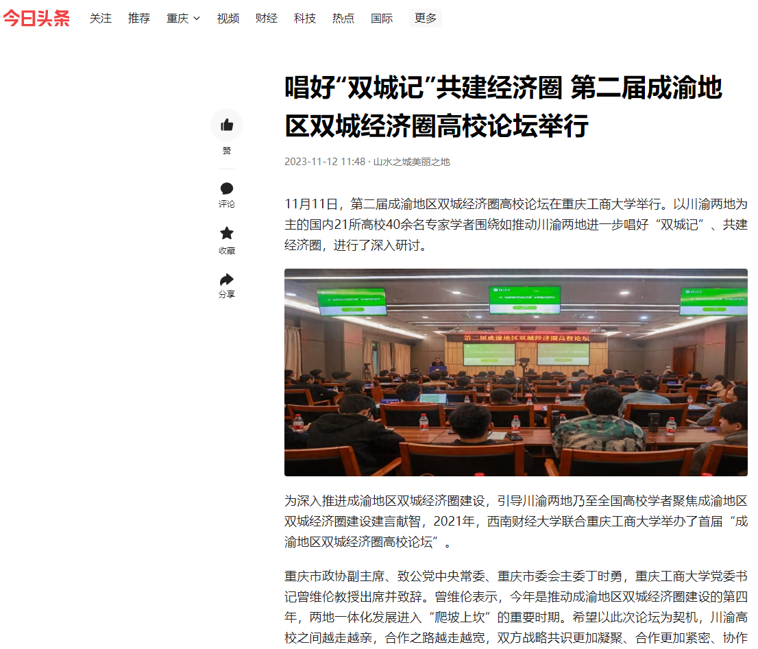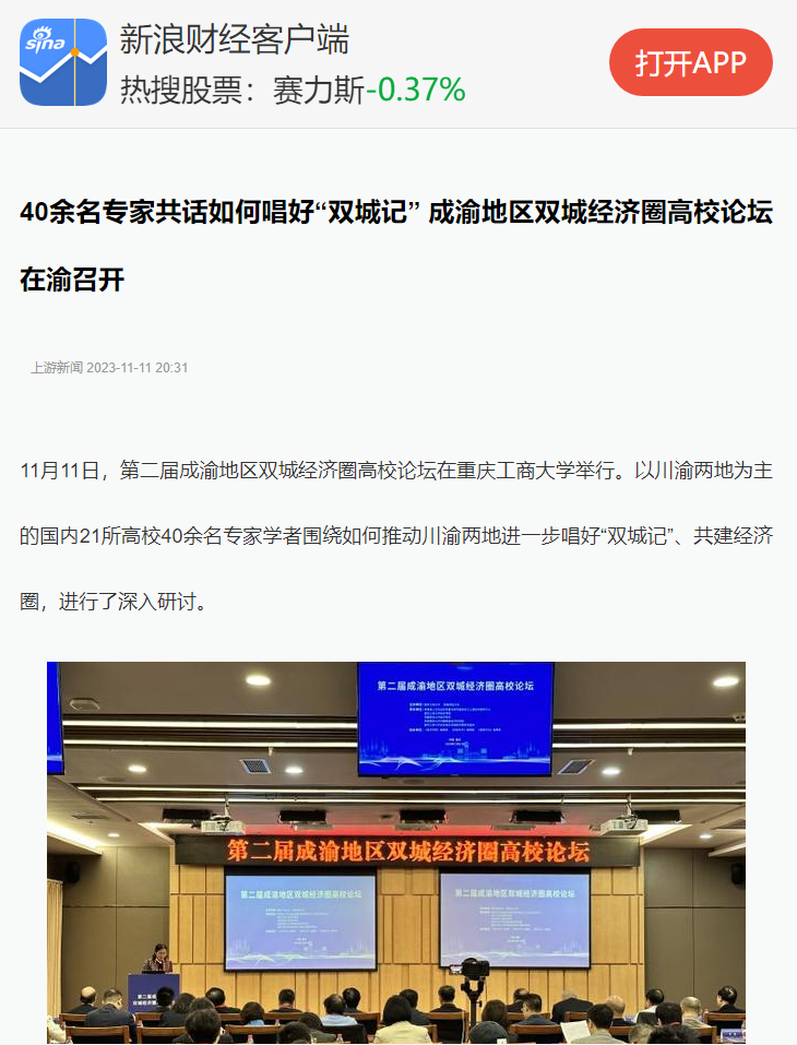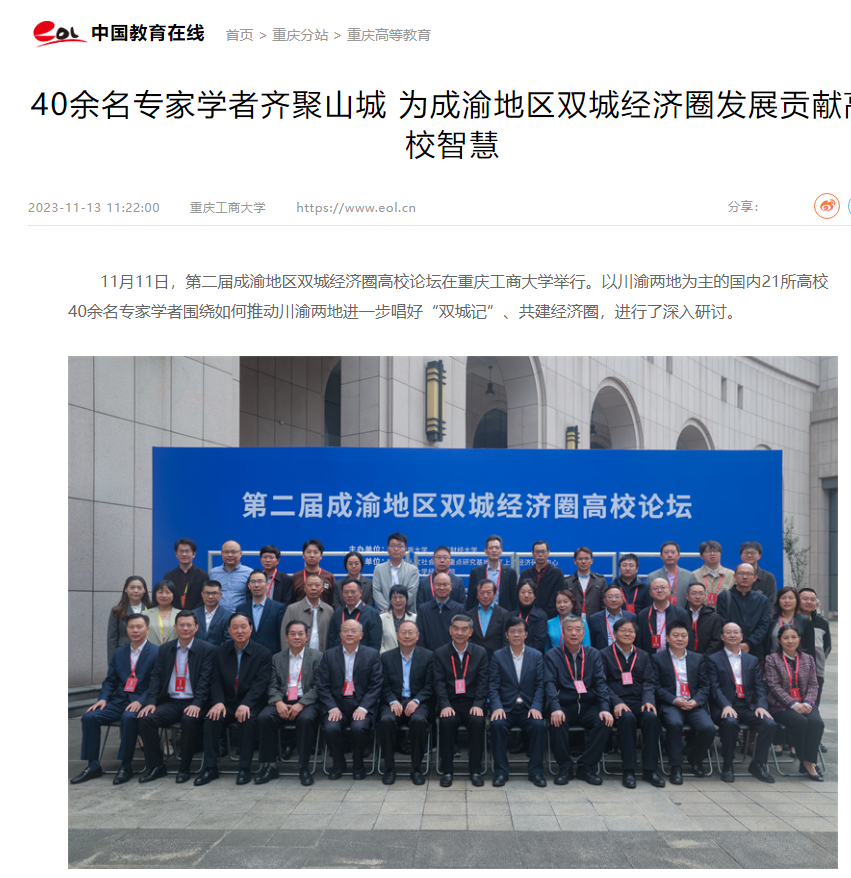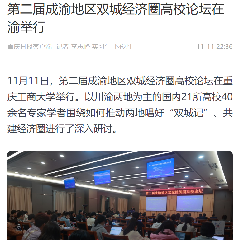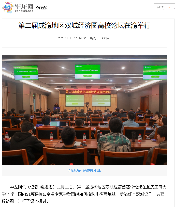 11月11日,由122cc太阳集成游戏、西南财经大学主办,教育部人文社会科学重点研究基地长江上游经济研究中心、122cc太阳集成游戏太阳成集团tyc122cc等单位联合承办的第二届成渝地区双城经济圈高校论坛在我校成功举办。重庆日报、上游新闻、华龙网、新浪网、新浪财经、今日头条等多家主流媒体对本次论坛进行了报道。