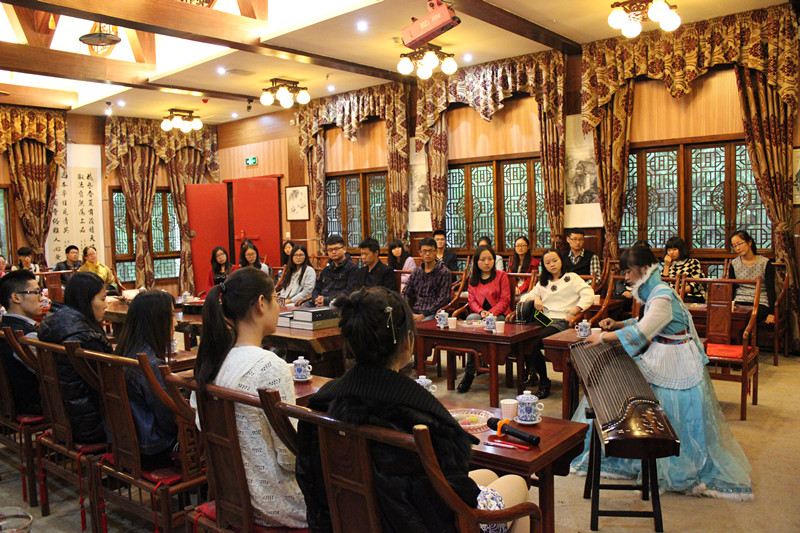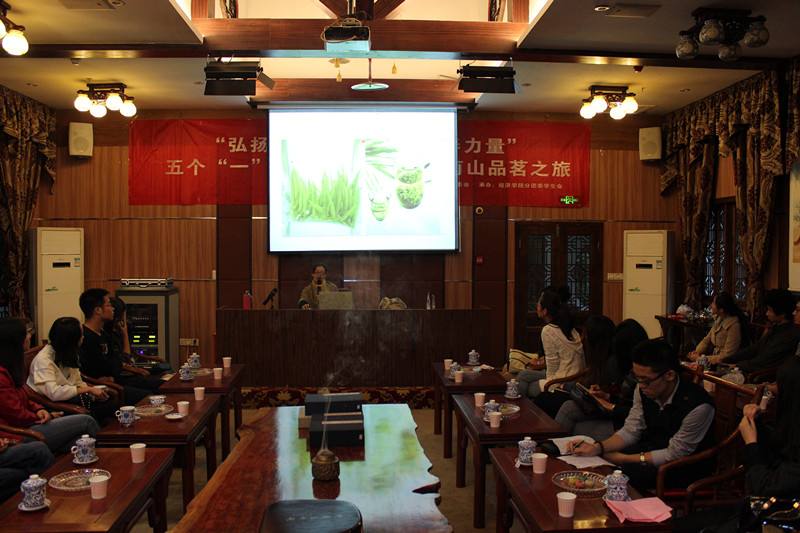 全场共可容纳54人,座无虚席,同学们凭借入场券陆续到场。本次品茗之旅在邓和文芳同学一首清脆悠扬的古筝曲《叮咚》中拉开序幕,同学们跟随旋律打起节拍;胡宝娣教授和大家一起分享“识茶之美”、“知茶之效”以及“舌尖上的茶”,品味茶“静、雅、纯”之性,其中最让胡教授垂爱的茶还属“致青春”,回味青春,先苦后甜;胡宝娣教授与其学生一起调制的阿萨姆奶茶以及茶社人员带来的茶艺展示在味觉和视觉上勾起同学们对茶浓浓的喜爱,所谓“品一口好茶,赏一门艺术”。经过教授以及茶社人员的讲解,同学们积极回答主持人关于茶的小知识的提问,整个活动现场显得有趣而又生动。会后所有嘉宾和同学合照留念,工作人员组织同学们有序离场。
