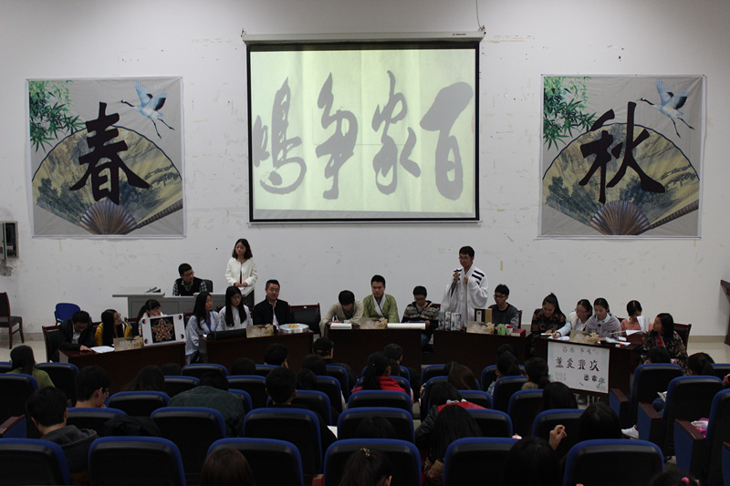 此次活动以“百家争鸣,梦回春秋”为主题,主要围绕春秋战国时期“儒、道、墨、法、阴阳”五大主流思想流派展开表演和辩论。由同学们分别组队代表五大学派,以不同形式介绍本学派的思想,通俗深刻,直观地展示了五大思想流派的不同主张和特点,精彩纷呈。随后即进行百家争鸣,各个学派分别用学派思想分析当今热点话题,其间不乏各个学派间的相互较量,可谓“仁者见仁,智者见智”,展开了一场别开生面的思想交锋和唇齿博弈。最后,经评委审定,墨家代表队夺得一等奖,阴阳家代表队、儒家代表队分列二三等奖。