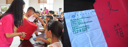鉴于市民学校中留守儿童居多,而大多数留守儿童都缺乏关爱这一情况,实践团成员们举办了“我想对你说”、“我最爱的人”等活动,建立心灵信箱,聆听孩子们的心声。活动中,每个小朋友都将自己想说的话写在纸上并投到心灵信箱中。“爸爸妈妈我爱您们”,“奶奶您辛苦了,我以后一定会好好报答您”“谢谢大哥哥大姐姐们陪我们玩,这是我最开心的一天”……歪歪倒倒甚至还夹杂着拼音的字迹,传达出他们内心深处的渴望。实践团成员们在信箱中发现了一张署名为“爱你们的儿子傅强”的信纸,上面写着“爸爸妈妈,我爱您们,感谢您们把我养大,暑假我可能来不了了,我会在家好好学习,天天向上……”读完小傅强的信,实践团成员们都哽咽了。小傅强的父母在外省打工,已经将近三年没回家,说好的今年小傅强会过去跟父母过暑假,可是懂事的小傅强不放心奶奶一个人在家。一句“可能来不了了”深深的触动了在场所有人的心弦。实践团的小燕子姐姐摸摸小傅强的头告诉他:“小傅强,你要努力学习,你的父母一定会为你感到骄傲!”。心灵信箱的建立,促进了实践团和孩子们的交流,也为实践团和二坪镇市民学校的留守儿童保持长期联系建立了基础。