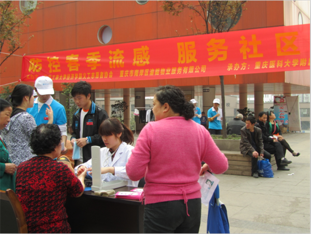 志愿者负责给人们免费发放防流感口罩,并给人们讲解预防春季流行疾病的生活小常识,帮助居民预防疾病。志愿者还请来了学府医院的医生来到渝能国际小区免费给人们测血压,告知居民预防疾病的重要性。