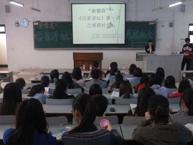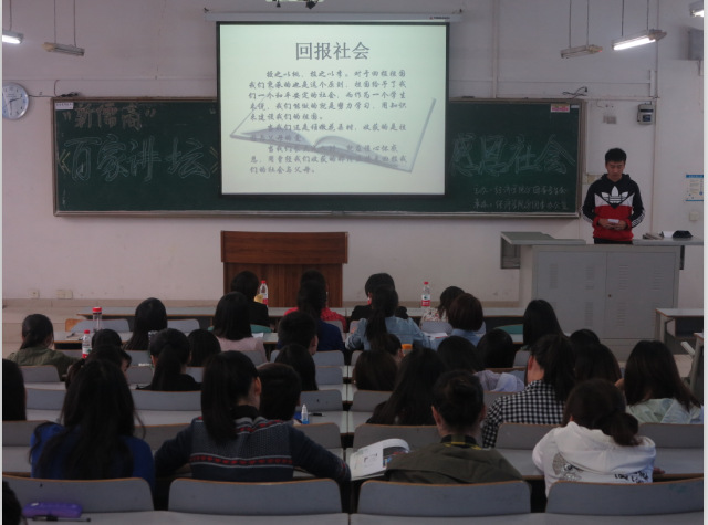 3月22日下午,由太阳成集团tyc122cc分团委学生会主办,太阳成集团tyc122cc分团委办公室承办的“新儒商”系列活动之《百家讲坛》第一讲“感恩社会”讲座在博智楼7408教室顺利举行。