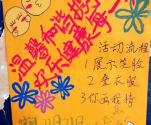 举办此次活动,旨在提高大家的寝室文化品位,促进大学生综合素质的提高,激励大家共同营造一个诚信友爱,和睦相处,充满活力的寝室文化氛围。活动共氛围三个比赛环节,采取淘汰赛的形式决出冠亚季军。第一个环节为笑脸PPT或视频展示环节,由参与报名的寝室按次序播放准备好的视频,评委根据笑脸阳光度以及笑脸灿烂度打分,第一阶段活动后选出得分最高的前九组寝室进入第二轮比赛。第二个环节为叠衣服比赛,比赛分为三轮进行,每轮3组,计时两分钟,每组叠一件T恤与一件衬衫,由评委根据速度与美观度依次进行打分。并选出得分最高的三组进入决赛。决赛比赛为你画我猜。由每组派出两个比较默契的代表,随即在工作人员的手中抽取卡片,一个人在黑板上画画,另一人来猜。每组限时一分钟,依据答对题目多少,再累加起前两轮比赛得分,来确定冠亚季军。经过几轮激烈的角逐与淘汰,本次活动的冠亚季军成功产生。在活动过程中,为了缓解现场的紧张气氛,主持人采用脑筋急转弯的形式进一步调动大家的积极性,并以糖果作为奖励。每当提出一个问题后,台下观众反应异常迅速,气氛异常热烈。就这样,活动在一种欢乐祥和的气氛当中落下了帷幕。活动接近尾声,由冯老师和郝老师为一二等奖寝室颁发了奖品,并且由冯老师对此次活动做了点评式的发言,冯老师指出,此次活动形式非常新颖,大家参与度极高,内容多样,称得上是一次比较不错的楼栋活动。同时,大自委的同学也对此做了点评,他们也对此次活动做出了较高评价。