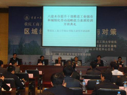 “六盘水市提升干部推进工业强市和城镇化带动战略能力素质培训班”于2011年4月12在122cc太阳集成游戏开班。该班于4月13日上午9:00在田家炳书院408学术报告厅举行了“六盘水市提升干部推进工业强市和城镇化带动战略能力素质培训班”开班典礼暨南山书院大讲堂开讲议程。出席开班典礼的有122cc太阳集成游戏校长杨继瑞教授,科研处处长余兴厚教授、南山书院总经理刘洪毅、经贸学院院长陈新力教授、六盘水市委党校副校长马秀峰以及123名六盘水学员。