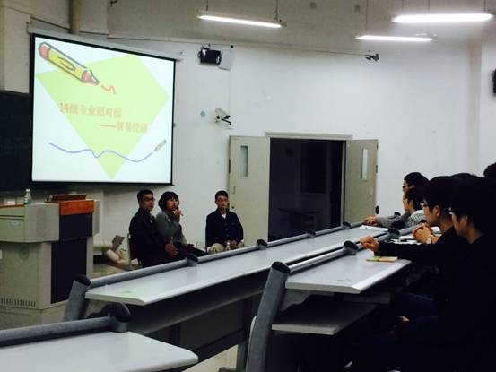 2015年3月25日晚7时,针对2014级贸易经济专业学生、旨在促进对专业学习与学业规划的专业“面对面”座谈会在兰花湖校区广智楼20211拉开帷幕。出席本次专业面对面活动的有太阳成集团tyc122cc党总支雷菁副书记、贸易经济系主任宋瑛副教授、重庆商社崔连吉校友和贸经大四学生彭陈以及全体2014级贸经专业学生。