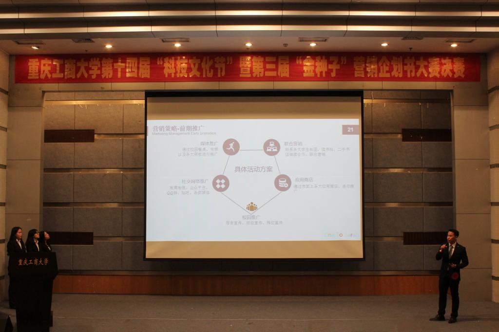 金种子从2013年开始举办至今,一直秉持“以赛促训、赛训结合、训战结合”的思路,不仅有企划书大赛,还结合大赛获奖项目开展针对性的创新创业培训、创业实战演练等,让同学们在校期间将理论与实践有机结合,切实提高创业能力,得到了同学们的广泛响应和积极参与。60多支队伍历经初赛、复赛的磨练,最终A.one鲁卡米、重商学塘等六支参赛队伍进入决赛比拼。本届“金种子”营销企划书大赛以“智能社区智能校园”为主题,以电子平台为主要营销渠道,激发同学们不断创新的创业潜力。决赛共包括创业项目PPT展示、现场答辩以及现场销售三个环节。在项目展示中,参赛队伍准备充分,从产品与服务、市场分析、营销战略和推广形式等多个方面对团队及项目进行了介绍和推广。在现场销售环节中,各支队伍现场抽取产品,对现场的评委们进行销售。同学们通过大胆的表现、新颖的销售形式,自信灵活的处理和面对销售中的重重困难,最终成功销售处自己的产品。最终,A.one鲁卡米团队凭借优异的表现获得一等奖,获得校友资助的创业基金3000元。赛后,张东祥教授对大赛进行了点评。他首先对这六个项目进行了点评,肯定了同学们的精彩展示。随后从策划书的书写、项目的选定、资金的来源以及项目的推广等多个方面给同学们做出了专业的指导,希望同学们可以选择更宽阔的视野,进行更广泛的选题,并增加市场调研,使营销企划更具可行性。