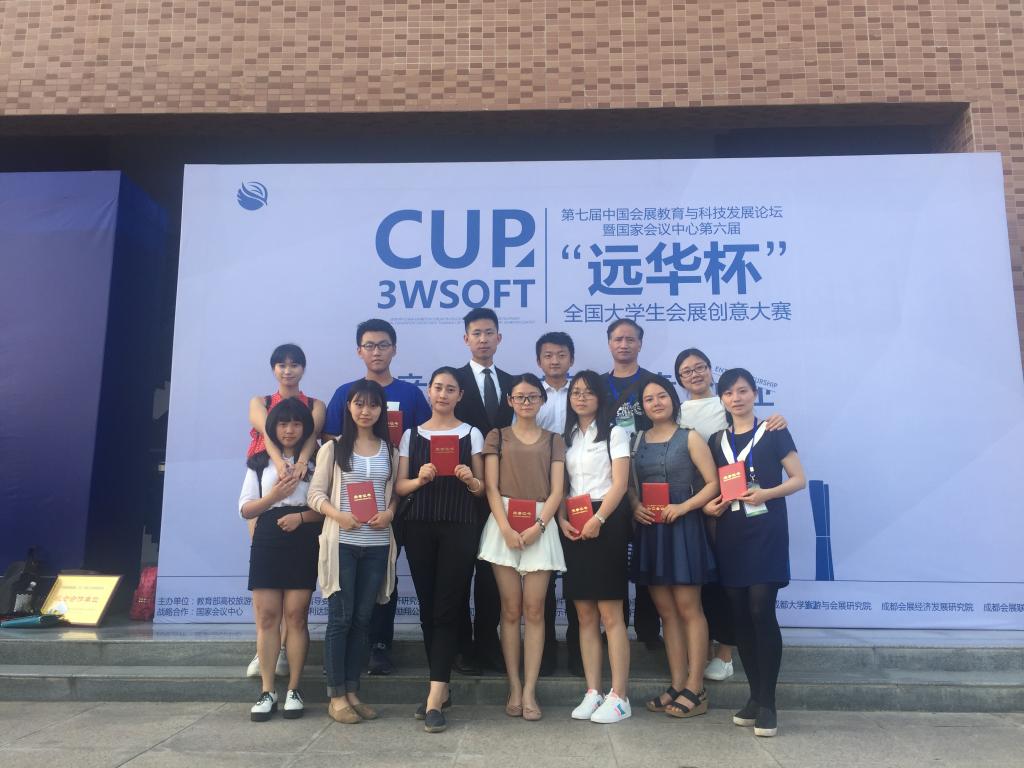 6月1日至4日,第七届中国会展教育与科技发展论坛暨国家会议中心第六届“远华杯”全国大学生会展创意大赛在成都大学举行。本次大赛由中国会展经济研究会和教育部高等学校旅游管理类学科专业教学指导委员会联合主办,每年一届,是全国性、行业性的大型赛事。本次大赛共有来自80余所高校的300余名选手参加,学院杨军、林黎、林新竹三位老师带领11名同学组成的两个团队参赛。经过激烈的角逐,最终取得了会展设计组二等奖,会展创意策划组二等奖的好成绩并与四川铁青会展服务有限公司达成协议,共建校企合作实训基地。