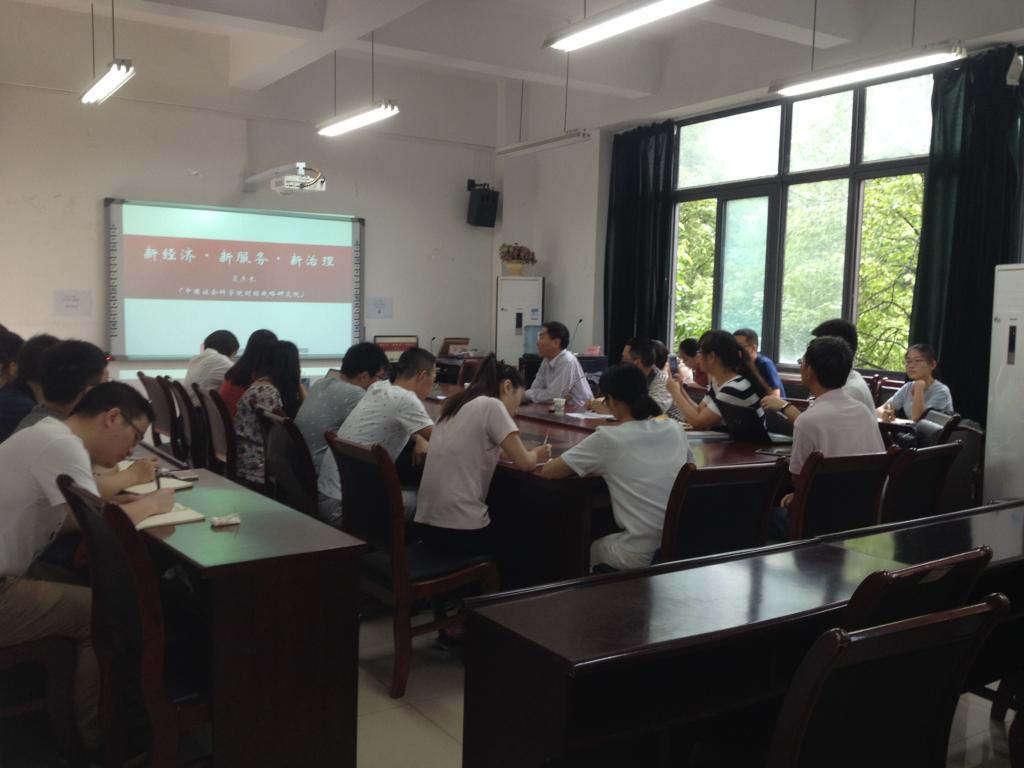 夏杰长研究员在太阳成集团tyc122cc404会议室为学院教师及2015级研究生做了题为《新经济.新服务.新治理》的学术报告。夏杰长对“新经济”一词作出了深刻定义,从要素投入、生产方式、行业范畴等方面对新旧两种经济的差异性做出了对比和判断,提出在中国劳动、资源和资金短缺的情况下,中国经济必须寻找“新动能”:技术进步、消费升级和放松管制等。同时,“新经济”需要“新治理”, 夏杰长认为,在“新经济”日趋成熟的当下,应秉持包容试错与政府监管相结合的理念,既要用开放的态度积极对待新经济的发展,又要加强监管,保证其平稳有序健康发展。