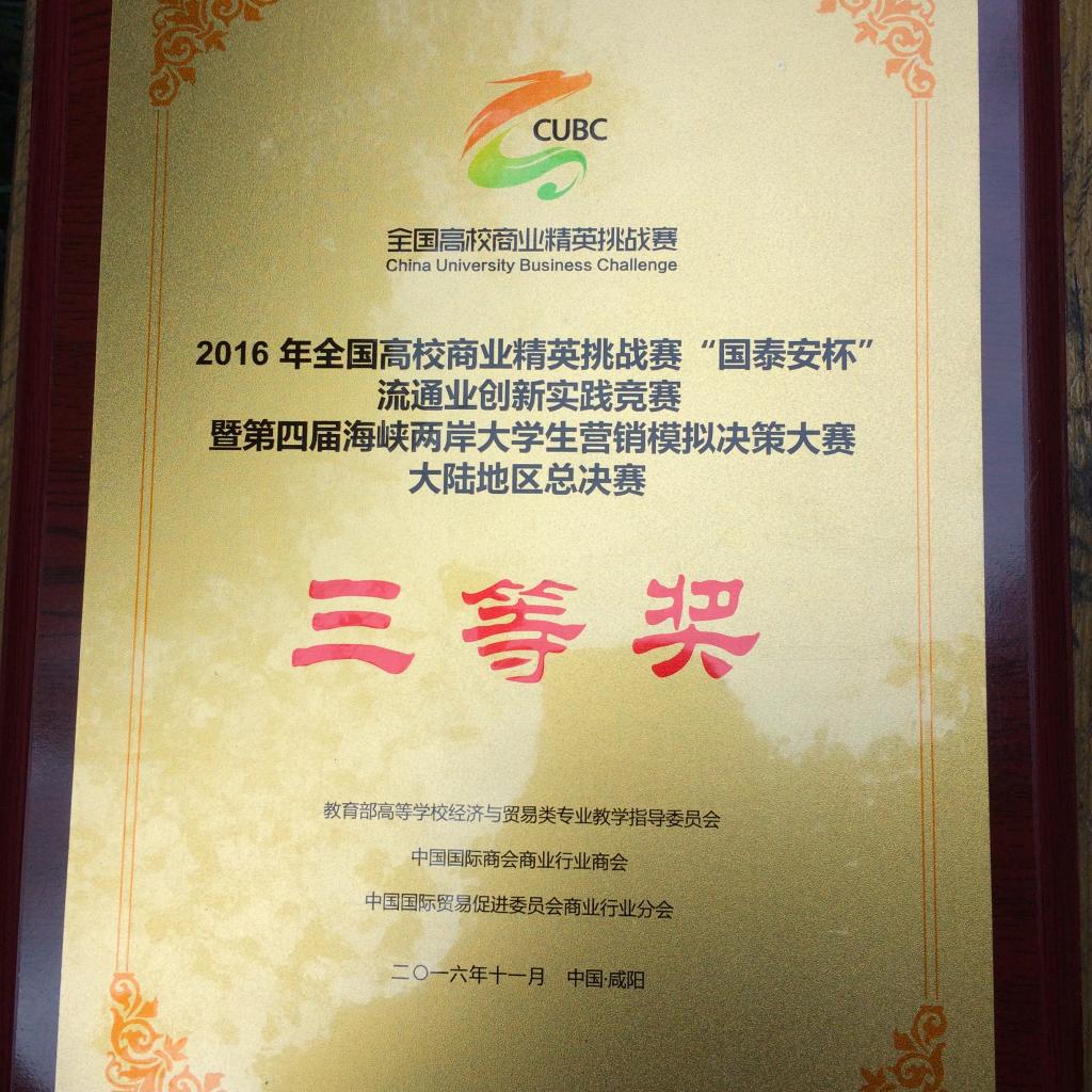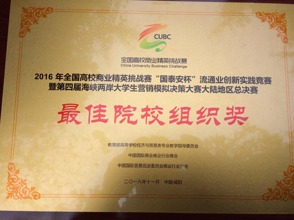 日前,由教育部经济与贸易类专业教学指导委员会、中国国际贸易促进委员会商业行业分会、中国国际商会商业行业会和深圳国泰安教育技术股份有限公司联合主办的2016全国高校商业精英挑战赛“国泰安杯”流通业创新实践竞赛大陆地区总决赛成绩在咸阳揭晓,由我院杨海丽、喻智成、刘瑜、张弛、沈红兵5位老师指导的6支队伍,分别获得一等奖(2支队伍)、二等奖(2支队伍)、三等奖(2支队伍),同时5位老师也分别获得“优秀教师指导奖”。