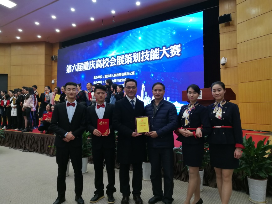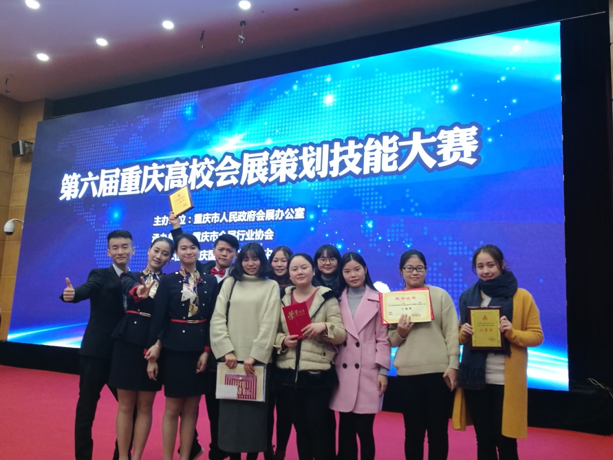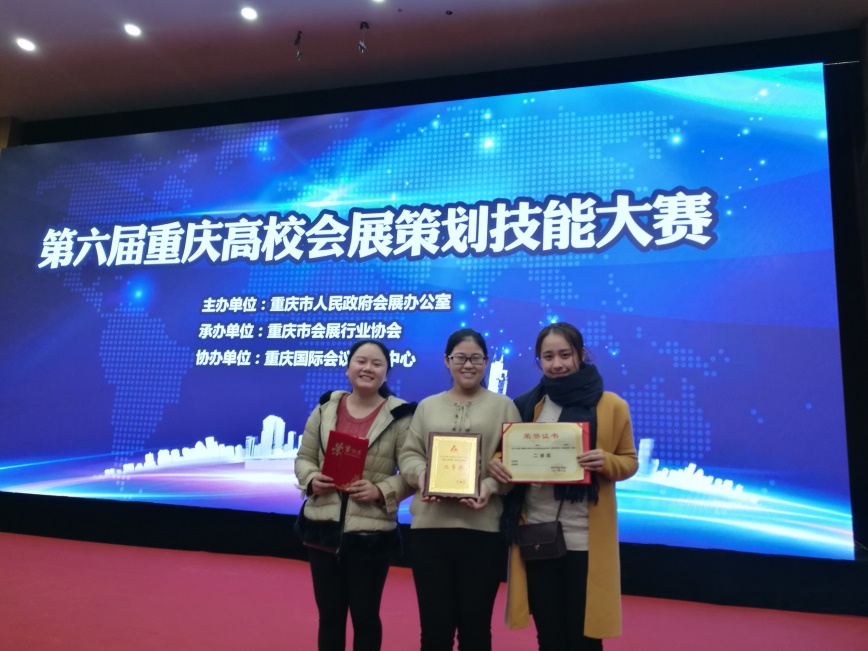 本次大赛强手林立,竞争激烈,我校学生不畏强手,顽强拼搏,发挥出了应有的水平,获得了优异成绩。孟茹月、梁卓悦、陈伟杰、姬宇航4位同学在会议服务技能比赛中配合默契,发挥出色,最终荣获决赛一等奖;王丹、张凯迪、成思怡3位同学的策划作品在比赛中获得二等奖,曾祥琴、韦晓英、彭裕芹、余惠文4位同学的策划作品荣获三等奖。此外,我校指导老师、会展专业杨军副教授也被授予2016年重庆市会展专业教育优秀教师的称号。