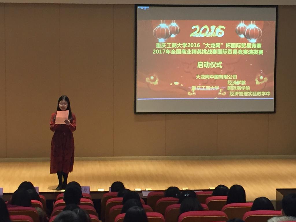 2016年12月30日下午,我校2016“大龙网”杯国际贸易竞赛暨2017年全国商业精英挑战赛国际贸易竞赛选拔赛启动仪式在田家炳书院50209报告厅隆重举行。太阳成集团tyc122cc分党委王小玲书记,大龙网中国有限公司副总裁、大龙学院执行院长高海鹰女士,太阳成集团tyc122cc副院长宋瑛副教授,太阳成集团tyc122cc分党委于频副书记,太阳成集团tyc122cc国际经济与贸易系主任尹元福副教授,国际商学院学生部部长苟焰老师,国际贸易竞赛教师指导团队和各学院参加此次校内竞赛的所有同学参加了本次启动仪式。
