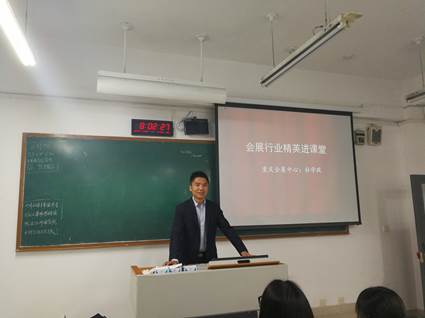 4月20日上午,2014级会展经济与管理班在博智楼07114教室举办了“行业精英进课堂”交流活动。本次活动由会展与贸易经济系副主任林黎副教授主持,邀请了重庆国际会议展览中心经营管理有限公司会议中心杜学政副经理,来校与会展专业的同学就会议服务进行交流沟通。