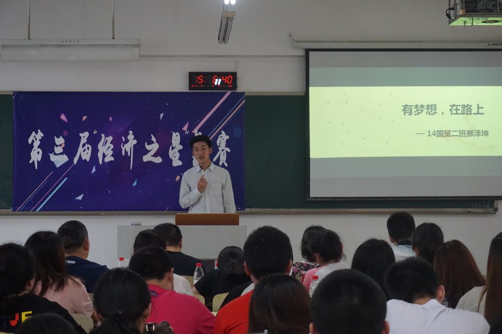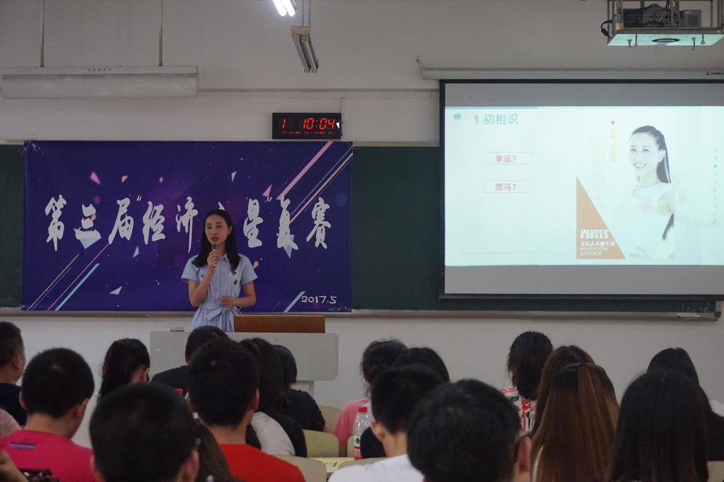 “经济之星”分为“”学习之星“、“公益之星”、“实践之星”、“文艺之星”、“体育之星”、“科技之星”6个类别,一经推出便受到同学们的大力支持与积极参与,目前已经成功举办了两届。此次“经济之星”评选活动于2017年5月启动,经过同学自荐、老师推荐等方式确定候选人。评选活动分为初赛材料审核、复赛现场答辩以及网络投票三个环节。初赛通过评委老师对选手材料认真审读筛选,优中选优,最后角逐出15位同学参与复赛答辩。