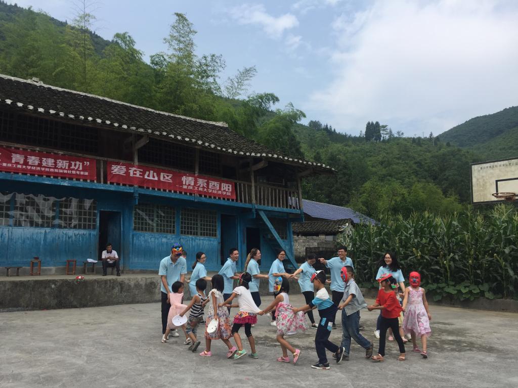 “黑黑的天空低垂,亮亮的繁星相随……”酉阳县兴隆镇营盘村小学简陋的教室里传出孩子们动人的歌声。122cc太阳集成游戏太阳成集团tyc122cc“酉阳兴隆镇营盘村小学‘爱心包裹’志愿者项目”是获得首届重庆市高校志愿服务项目大赛金奖的项目。今年,也是志愿者们来到营盘村小学支教的第五个年头。虽然每月都有爱心包裹送递,但一年不见,孩子们还是怯生生的。在志愿者动听的吉他弹唱中,孩子们逐渐向志愿者们聚拢,志愿者们一句一句教唱,最终大家一起合唱了这首“虫儿飞”,稚嫩的歌声回荡在山间,孩子们认真的神情让志愿者们特别感动。