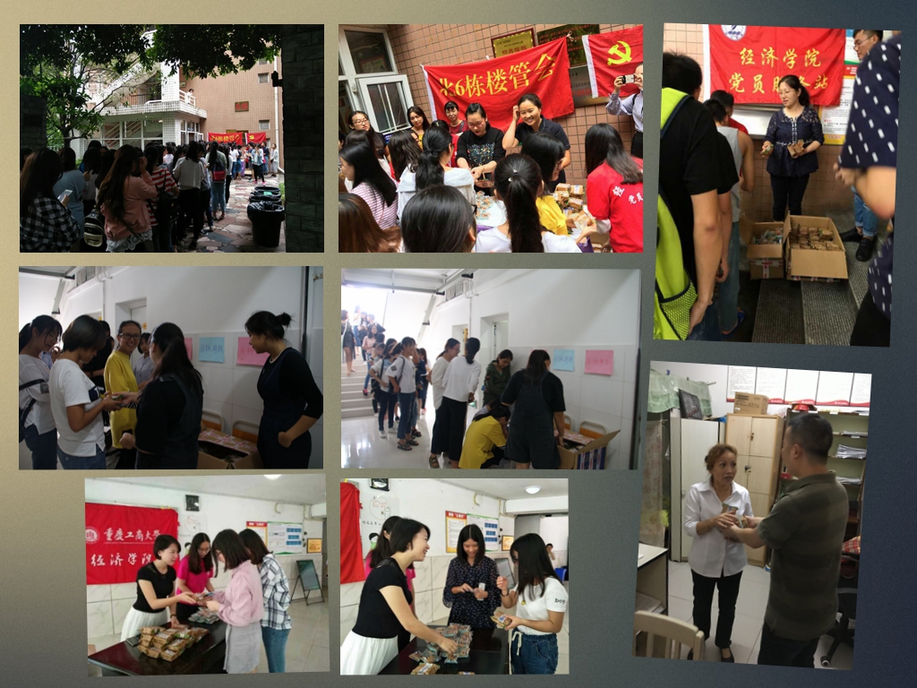 秋风送爽,明月皎皎,伴随着八月桂花香的阵阵香气,中秋佳节如约而至。为了迎接中秋佳节的到来,2017年9月22日太阳成集团tyc122cc党员服务站、分团委学生会、楼栋联袂在北六、北二十一、北十五(十六)、南二楼栋开展了一次中秋佳节发放月饼的送温暖活动。太阳成集团tyc122cc分党委王小玲书记、于频副书记、党员服务站的指导老师郝颖老师和楼管会主任喻智成老师、邓雪霜老师、分团委书记蒋敏老师各自去楼栋亲自为同学们发放月饼。