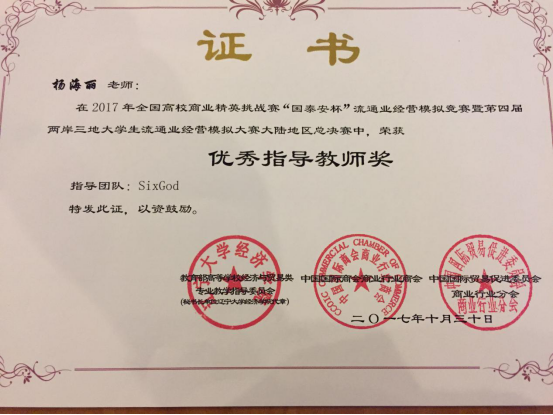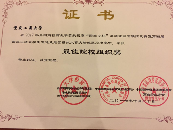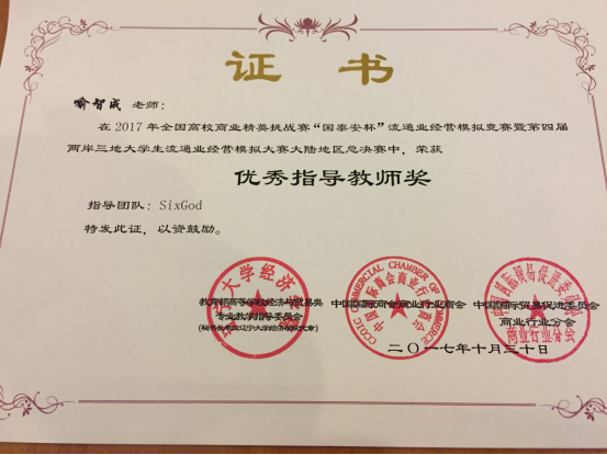 近日,由教育部高等学校经济与贸易类专业教学指导委员会、中国国际商会商业行业商会、中国国际贸易促进委员会商业行业分会主办的2017年全国高校商业精英挑战赛“国泰安杯”流通业经营模拟竞赛暨第四届两岸三地大学生流通业经营模拟大赛大陆地区总决赛成绩揭晓,由太阳成集团tyc122cc教师杨海丽、喻智成两位老师指导的5支参赛队伍,分别获得一等奖(1支队伍)、二等奖(4支队伍),同时我校也获得最佳院校组织奖,两位老师分别获得“优秀指导教师奖”。