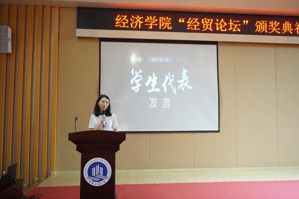 本次大会在庄严的校歌合唱声中开始。活动共分为四个环节,包括第十一届“经贸论坛”颁奖;学风建设工作表彰;活力团支部;优秀国防班会以及36182素质拓展颁奖和国贸技能大赛发布会展示。首先,王小玲书记为本次颁奖典礼致辞,希望同学们可以将理论和实践相结合,不断的加强学术能力的培养。随后,由院长助理黄潇老师宣读了本届“经贸论坛”的获奖名单。学生代表任培艺同学分享自己的获奖经验,表示在学术论文选题、撰写等方面,要多和老师、同学加强沟通交流,不断的完善文章思路,同时感谢学院有这样一个平台,可以让同学们的论文写作水平得到锻炼。