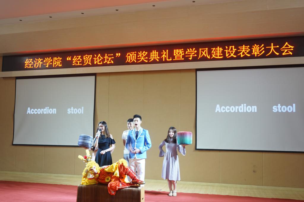 紧接着,王小玲书记和于频副书记分别宣读了学风建设工作获奖名单以及活力团支部、优秀国防班级和36182素质拓展工程获奖名单,获奖团体、个人代表分别上台领奖。学风建设获奖班级代表马影同学发言,表示班级的荣誉是所有同学努力而来,在今后的学习中也会再接再厉,继续拼搏努力。活动最后环节,由即将赴宁波参加国贸技能大赛的同学们为在场的观众带来了一场精彩的产品发布会,新奇的造型,精彩纷呈的全英文展示,引得现场观众阵阵惊叹,掌声不断。