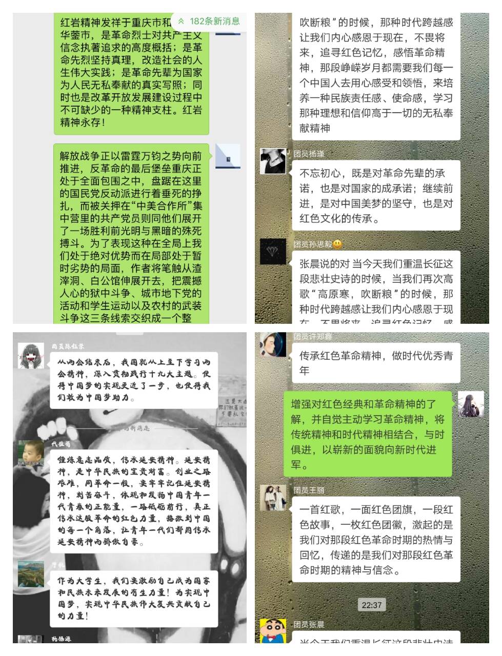 此次团日活动主题形式多样,内容丰富,各支部准备充分。有的团支部以“追寻红色记忆 传承革命精神”为主题,通过微视频,主题朗诵,以及实地考察参观等形式,真切地追忆了红色年代革命的英雄事迹,感受革命英雄可歌可泣的奉献精神,激励我们青年团员不忘初心。有的团支部以“传承国学经典、增强文化自信”为主题,在活动中开展以文学诗词比赛,感受国学经典的魅力,增强团员的民族自信心和自豪感。有的团支部以“两会助力中国梦青春向上敢为先”为主题,把握时代脉搏,了解时政,在活动中以游戏以及精彩的演讲来增加同学们对于两会的理解,提高同学们的思想修养和政治觉悟,加大广大青年团员对时事的关注,将两会精神与现实工作、学习结合起来,使同学们坚定理想信念,明确学习目标,增强学习动力。此外,青年团员们活动后积极在线上发表感想,提高自我思想道德修养。