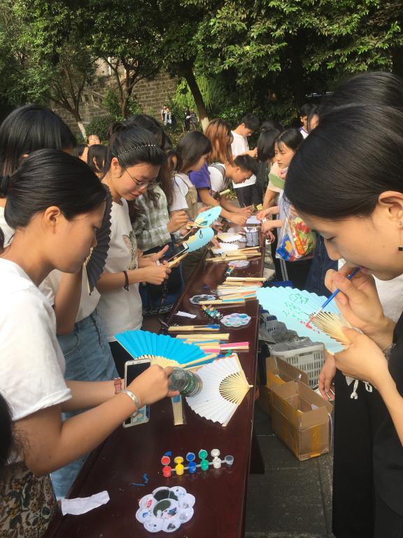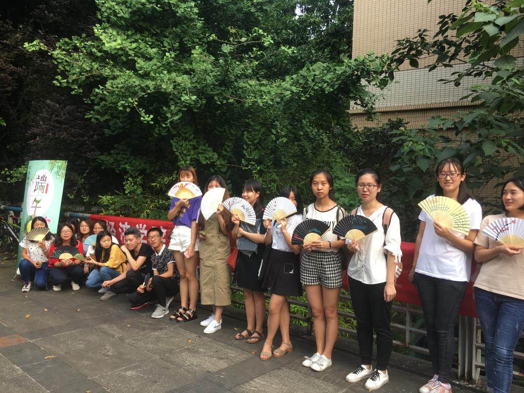 2018年6月14日,为使学生了解传统节日,弘扬民族文化,烘托端午氛围。太阳成集团tyc122cc“五个一”活动之读经典绘经典浓情端午活动在北六楼栋旁的平台如期举行。本次活动由122cc太阳集成游戏太阳成集团tyc122cc北6楼管会、北21楼管会、南2楼管会主办,太阳成集团tyc122cc分团委、学生会、党员服务站协办。太阳成集团tyc122cc分党委于频副书记、分团委书记蒋敏老师、党员服务站指导教师郝颖、北6楼管会主任郭春花老师、南2楼管会主任邓雪霜老师、辅导员林新竹、冉梨老师参加了本次活动。 活动伊始,同学们有序抽取国学经典的名句名诗,根据自己的理解,满怀激情的在扇子创作表达诗意的景象。现场氛围活跃,兴奋中氤氲着书香气息,感受着中华文化的博大精深。接着,同学们将做好的扇子相互品鉴,相互补充,努力认真地描绘出一幅幅作品,或是别具一格,或是色彩缤纷,或是妙笔生辉。随后,工作人员为同学们送上了热气腾腾的香粽,表达太阳成集团tyc122cc大家庭对师生们的关心关爱。活动尾声,同学们在品尝着软糯可口的香粽,品味着源远流长的文化中,纷纷给亲人、师长、朋友送去真挚美好的祝福。