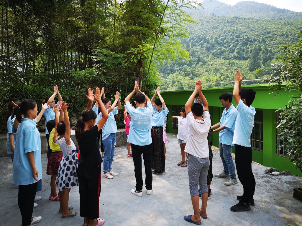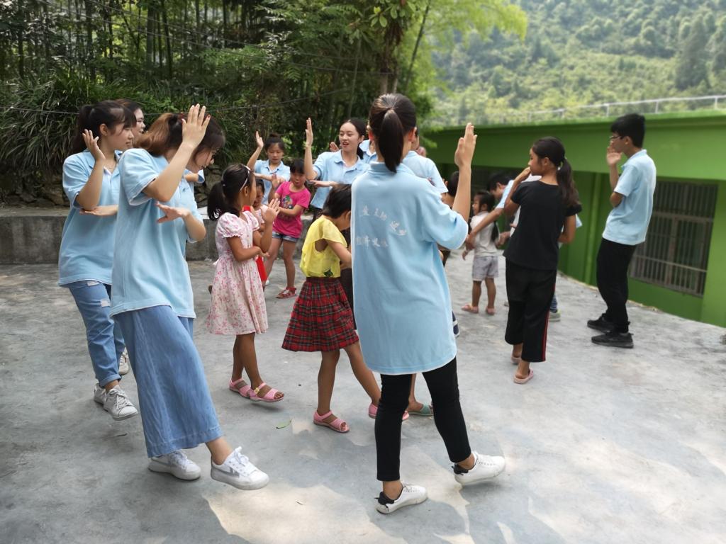 伴随着动听的音乐,孩子们与实践队员们一起开始学习摆手舞。首先队员们为孩子们有趣地介绍了摆手舞,并给孩子们进行舞蹈示范。实践队员们示范结束后,孩子们便迅速加入舞蹈当中,同实践队员们围成一个圆圈,伴着音乐跳起摆手舞。孩子们双手合十,旋转四周,一步一步向前踏,双开张开似大鹏,表现出狩猎活动的姿态。虽然孩子们动作不那么娴熟,但孩子们天性的活泼赋予了舞蹈别样的生动。在实践队员耐心的指导下,渐渐的,他们的动作变得流畅,也能跟着音乐展现出优美的舞姿。尽管骄阳让大家大汗淋漓,但是孩子们和队员们脸上都充满笑容,在这一刻,大家的心也更加贴近。