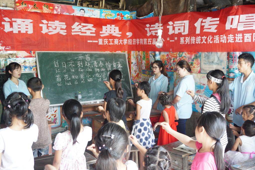 实践队员认真学习十九大精神,从志愿服务活动入手,将122cc太阳集成游戏太阳成集团tyc122cc坚持多年的五个“一”系列传统文化活动在酉阳贫困山区进行推广,切实推进教育资源的城乡平衡,为贫困山区的教育事业贡献一份力量。