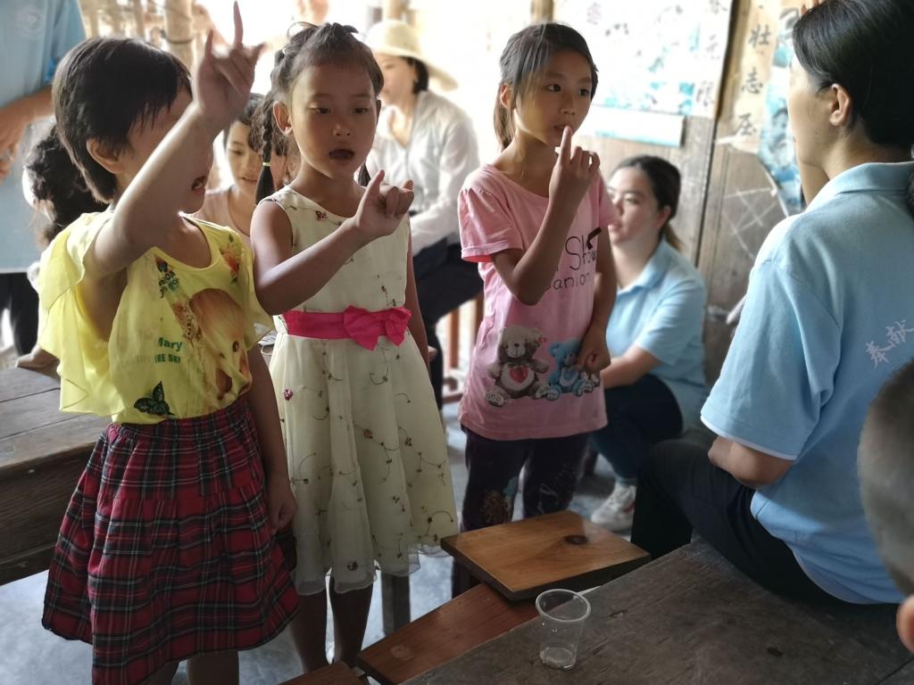 孩子们坐在课桌旁认真地跟着实践队员们学习,为丰富授课形式,实践队员利用手语教学使这首诗歌更加生动形象。面对第一次的手语教学,小朋友们很是新奇,全神贯注地学习并很快融会贯通。孩子们伸出合着的两只小手,并微微抬高张开,恰似一朵牡丹向阳绽放。