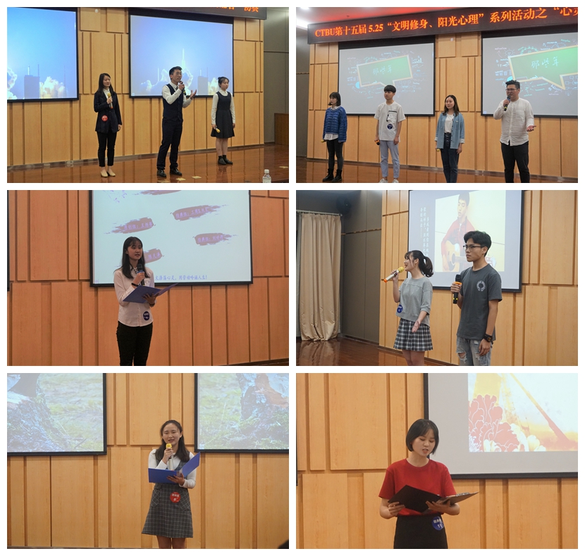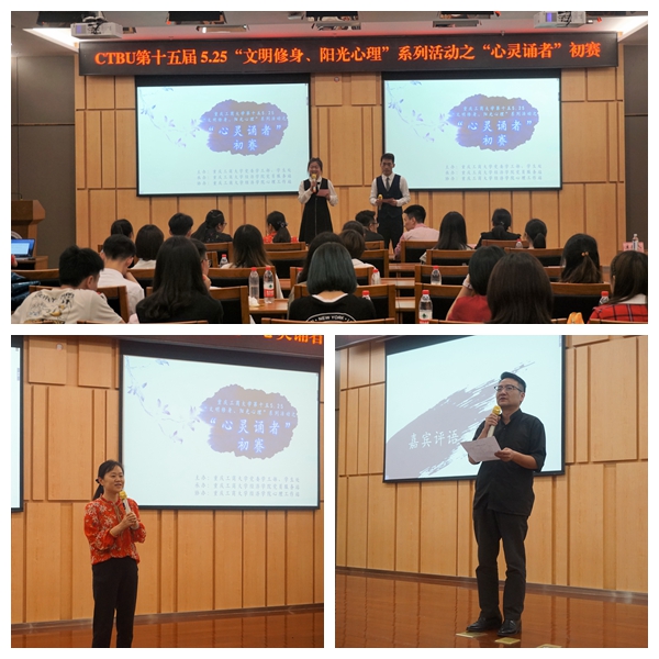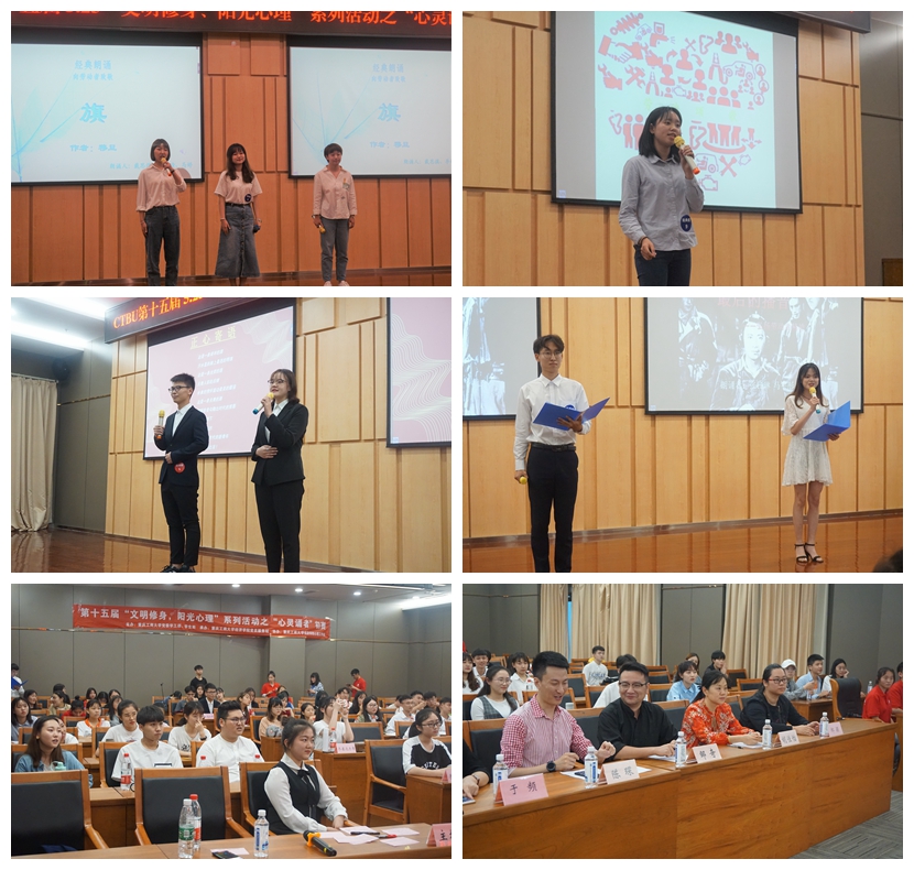 为了加强我校学生心理健康教育工作,营造健康良好的校园文化氛围,由党委学工部、学生处主办,太阳成集团tyc122cc党员服务站承办和太阳成集团tyc122cc心理工作站协办的第十五届“文明修身,阳光心理”系列活动之“心灵诵者”初赛于2019年5月10日晚上在新图书馆第一会议室成功举办。此次活动的主题为“汲取劳动智慧,吟诵劳动精神,做心灵的强者”,邀请到学校大学生心理健康教育与咨询中心胡佳怡副主任、通识学院邹奇副书记、校团委陈琛老师担任活动评委,另外太阳成集团tyc122cc于频副书记和郝颖老师作为嘉宾也到场参与了此次活动。