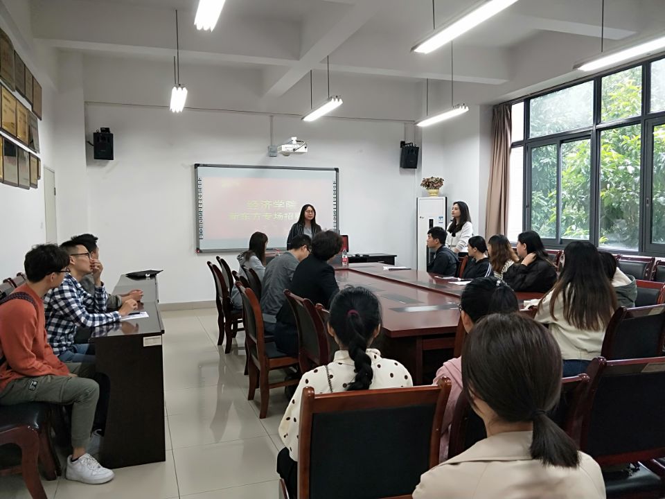 重庆新东方学校于2003年9月25日注册成立,它是新东方教育科技集团旗下的第九所分校,从成立之初重庆新东方就以综合类外语培训为主业,其岗位需求与我校国际经济与贸易、贸易经济、经济学、英语等专业比较对口。首先,新东方罗经理放映了宣传片,引出:新东方是谁?新东方能给你带来什么?你可以来做什么?她介绍了新东方集团、重庆新东方的发展、团队构建、企业文化等。针对同学们关心的人才培养、晋升以及待遇福利等做了详细阐述。然后,在新东方任职的15级贸经二班的唐心月学姐进行了经验分享,她讲述了自己从助教到助教长再到学业规划师的历程,并针对同学们提出的如法定节假日的调休、平均薪资等问题进行解答。随后,王书记表示教育是朝阳产业,鼓励同学们积极尝试,多与用人单位工作人员沟通交流,找到自己的兴趣所在,识别自我。最后,新东方工作人员组织了现场面试,与同学们进行了单独的沟通交流。