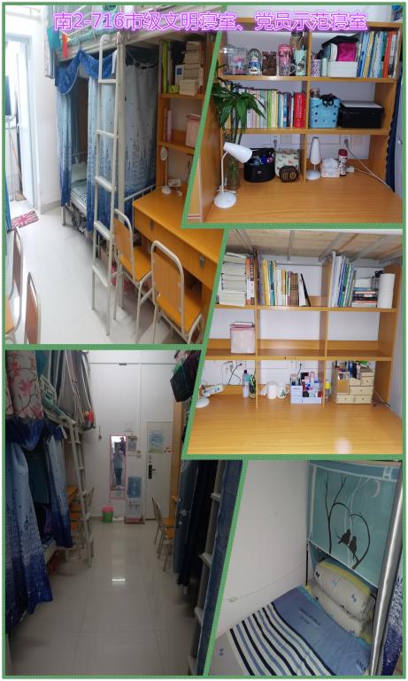 612寝室作为市级文明寝室的获得者,每日清洁检查中成绩优异,五位寝室成员不仅学习名列前茅,而且积极参加各种活动,在院校学生组织中担任主要学生干部。712寝室的学习氛围浓厚,注重专业的理论与实践结合,积极参加院、校、市、省的各类竞赛活动,并获得佳绩。716寝室的四位成员中有3名党员,积极帮助周边的同学,积极为他人解决学习生活上的困难。