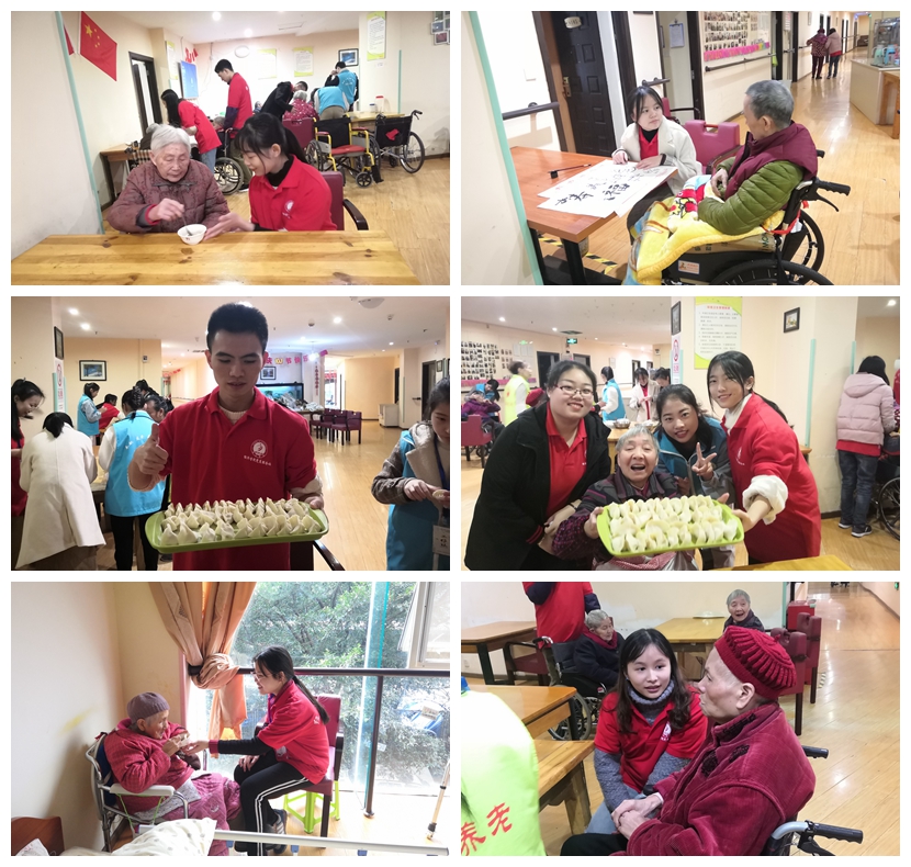 14点30分,经济学子们帮助刚午休完毕的老人们起床、穿衣、带老人们在房间里走动,活动身体。随后,一部分同学陪同老人们的同时,另一部分同学开始为老人们包饺子,煮饺子。在养老院工作人员的介绍和帮助下,同学们都尽量根据老人们的喜好和身体状况进行服务,有的为老人按摩;有的陪老人下棋;有的陪老人唱歌;有的听老人唠家常……。饺子煮好后,太阳成集团tyc122cc的同学们便为老人们盛好饺子并喂老人们吃。太阳成集团tyc122cc党员服务站成员热情洋溢,对老人们关心体贴,老人们脸上也都洋溢着幸福的微笑,同学们也满心欢喜。16点30分,此次聚福岛养老院志愿服务活动圆满结束。