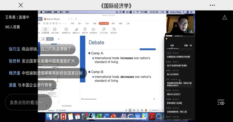 教学亮点纷呈 学生互动性高太阳成集团tyc122cc在线教学亮点纷呈,准备充足,深入浅出,学生们听得津津有味,互动性高。谢新教授采用全英文授课,体现我院高水平学者风范;黄潇副院长通过小故事视频导入,开启同学们对经济博弈论的兴趣;杨军教授和刘晗老师分别在“政治经济学”和“微观经济学”课程中有机融入课程思政元素,每堂课都是一堂课堂思政。张桂君、敬震海等老师在教学中设计了很多启发式、讨论式问题,鼓励同学们用弹幕的形式回答问题,得到了积极响应;黄玲、杨立卓老师通过输入文字+发言进行互动,让学生的精力随时集中在听课内容上;杨海丽老师准备充分,商品学课程互动性高,同学们反响极高;何泱泱、王希晨等老师为全英文课程设计了有趣的互动环节,同学们积极主动去研究每一页课件的内容,学习效果好。新教师赖辉备课非常充分,以中国和双层经济圈案例导入课程,通俗易懂,学生兴趣高。