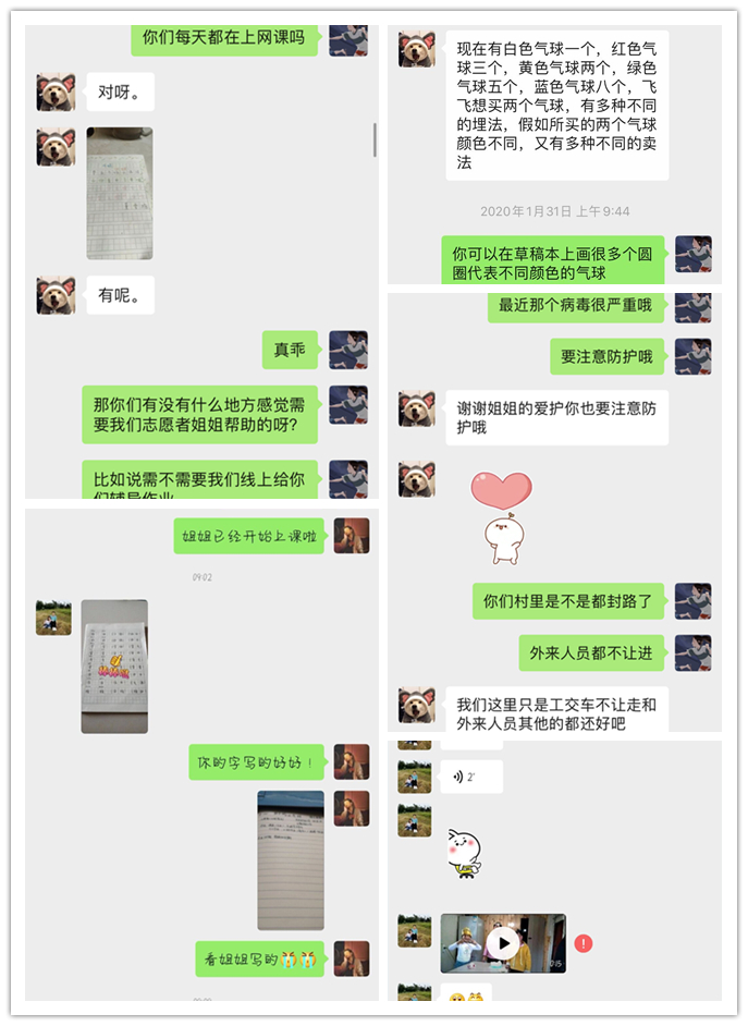 今年是太阳成集团tyc122cc志愿者帮扶营盘村孩子们的第八个年头,每年如期而至的爱心包裹和暑期实地走访已经成为了孩子们的期待与牵挂。而如今在疫情防控的关键时期,志愿者们仍然坚持采用线上的方式开展教育扶贫和扶智工作,主要从心理和学习两方面对营盘村的孩子们进行线上指导。志愿者们通过微信、QQ、电话等方式对营盘村的孩子们给予远程的关心与问候,询问了解孩子们的衣食住行,以及疫情期间家里的生活现状,实时关注每一位孩子的心理感受并适当鼓励支持。同时向孩子们传播正确的疫情知识,让他们能够了解并做好有效的防护措施;耐心细致对孩子们进行线上功课辅导,让孩子们停课不停学。