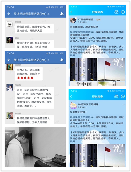 悼念仪式结束后,在太阳成集团tyc122cc党员服务站曲容良站长的带动下,同学们纷纷在群里倾诉哀思,“清明追思布谷鸣,家国永念康子春。”“以凡人之躯,比肩神明!”“我们的岁月静好都是你们在守候,感恩英雄,向你们致敬!”每一句都饱含同学们对英雄最真挚的敬意与最深切的思念。他们用血肉之躯抵抗病毒,以满腔热血奋战“疫”线,而我们能做的就是守护他们用生命换来的成果,用行动告慰逝去的同胞。