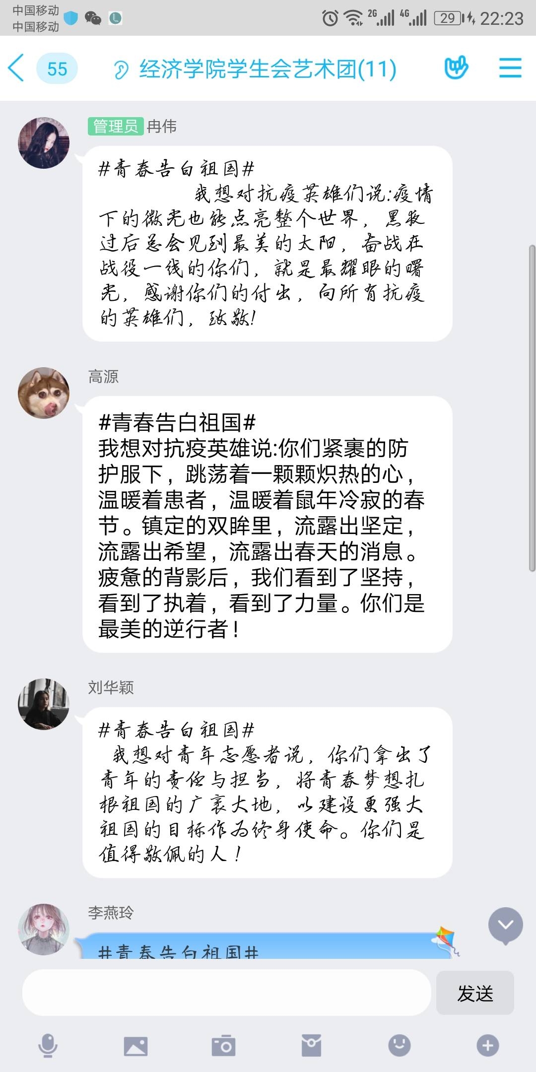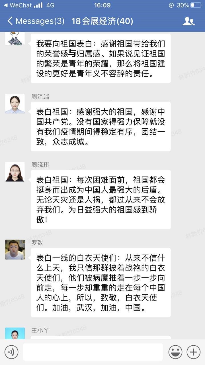 “青春告白祖国,我想对祖国说:何其有幸,生为中华儿女。天灾人祸,有你在便得安心。神州大地团结一心,愿我国早日恢复,繁荣昌盛。”在这个特殊五四青年节,大学生团员们虽然暂时不能返回校园,但激情与活力未减。太阳成集团tyc122cc分团委积极响应校团委号召,举办以“学习五四精神,青春告白祖国”为主题的活动,组织团员们学习习总书记五四讲话精神,并运用企业微信、QQ等各种线上平台的交流群,组织团员们以青春之我,告白祖国、告白共青团、告白奋斗中的广大中国青年,字里行间都流露出团员青年最真挚的感情。