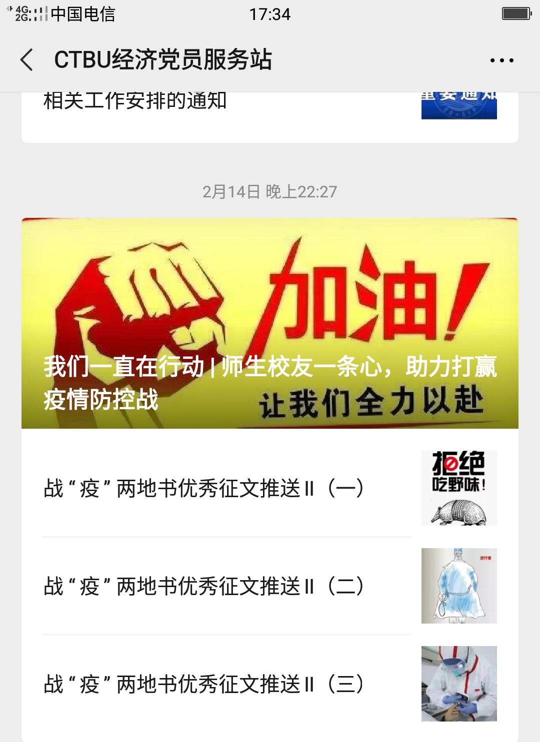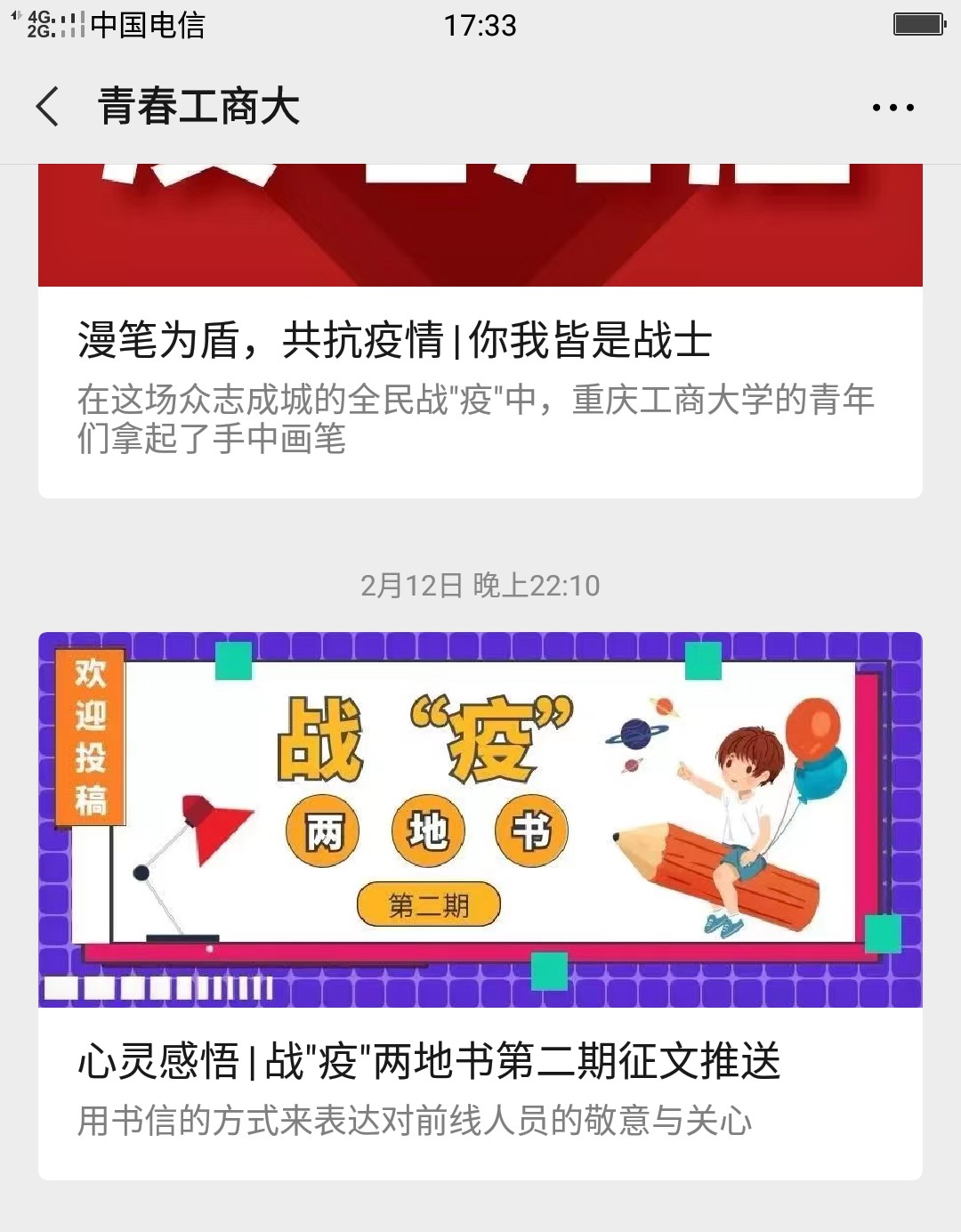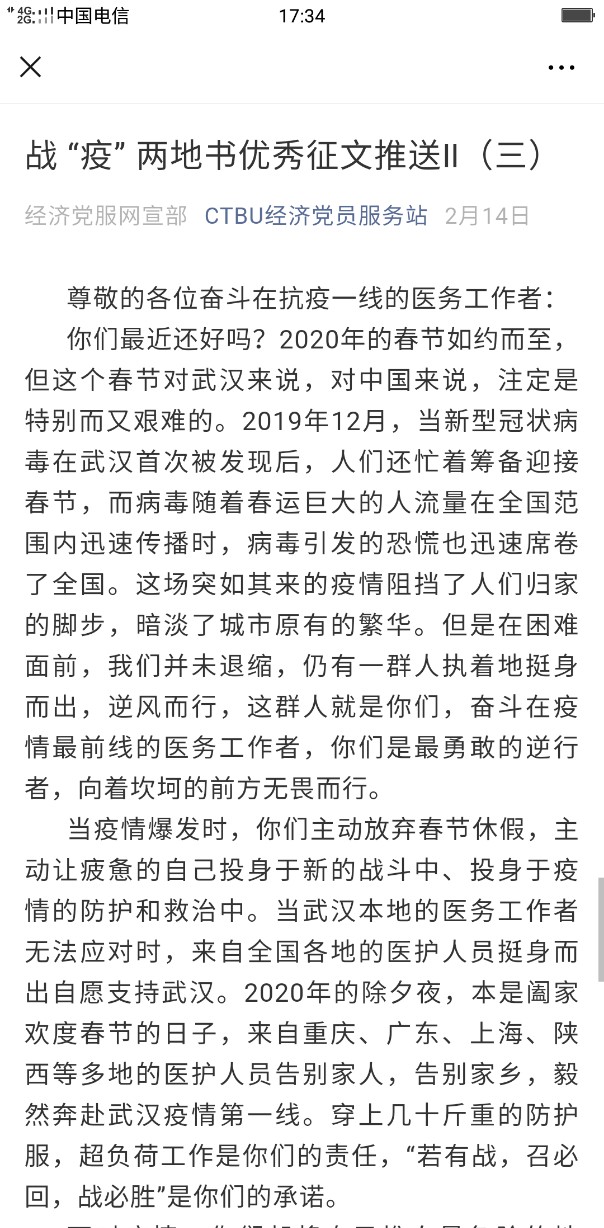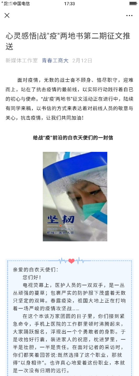 自新冠疫情发生以来,学校学工部、校团委、太阳成集团tyc122cc联合主办“战‘疫’两地书”活动,以“给......的一封信”的书信形式,征集原创、尚未公开发表征文,给奋斗在一线的广大医护人员、基层干部或湖北、武汉的同学们送去温暖与正能量。