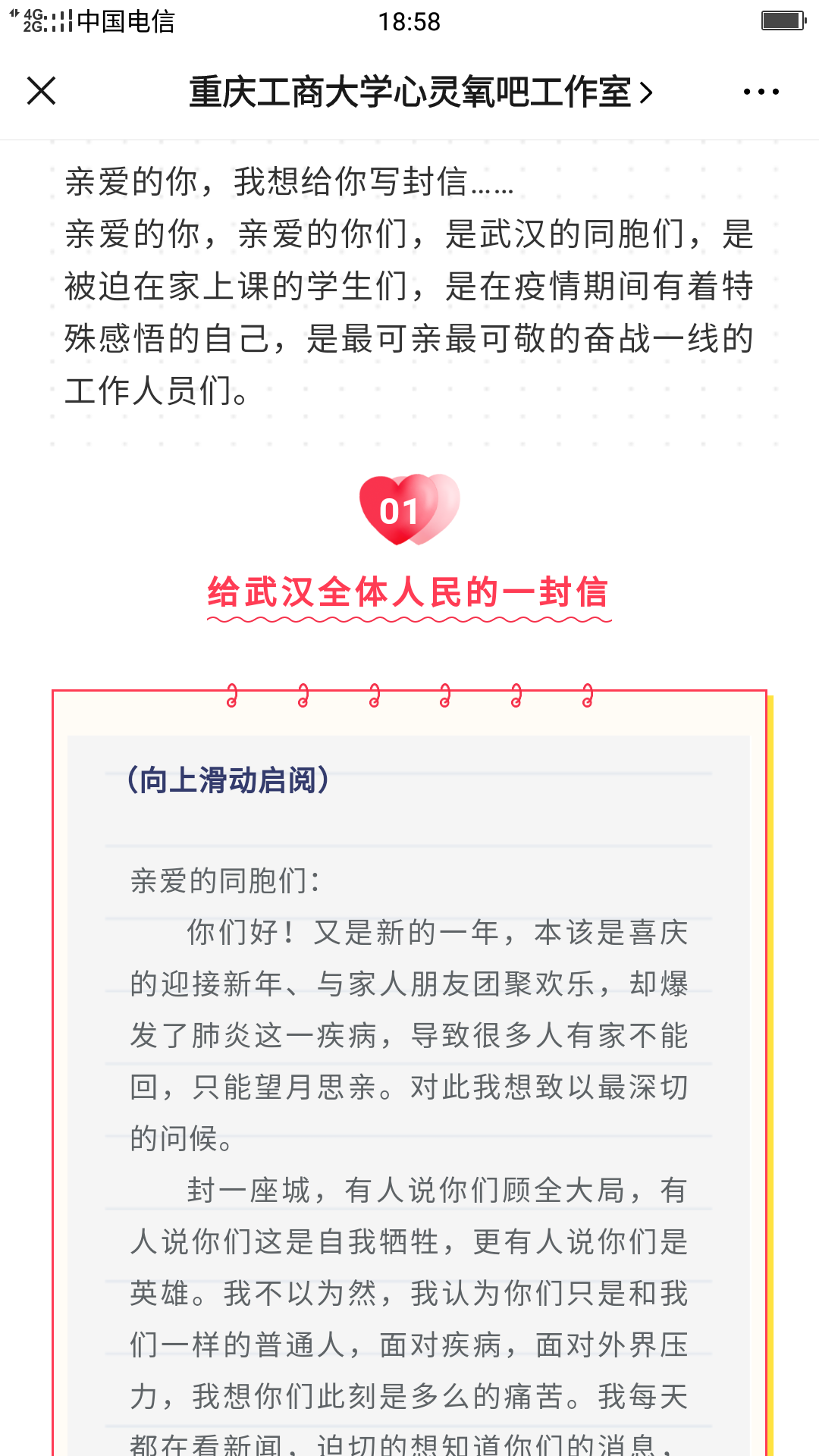《给“白衣战士”的一封信》、《给钟南山院士的一封信》、《给武汉同胞们的一封信》、《给新冠病毒的一封信》......这一封封的信件寄托着122cc太阳集成游戏学生的敬佩、关心、希冀、牵挂,让艰难的日子充满温情,让战“疫”充满必胜的信心。