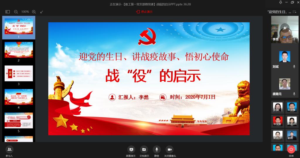 7月1日晚上19点1分,太阳成集团tyc122cc教工一支部借助企业微信平台开展了“迎党的生日、讲战疫故事、悟初心使命”线上组织生活会,会议由支部书记李然同志主持,全体支部党员参加。