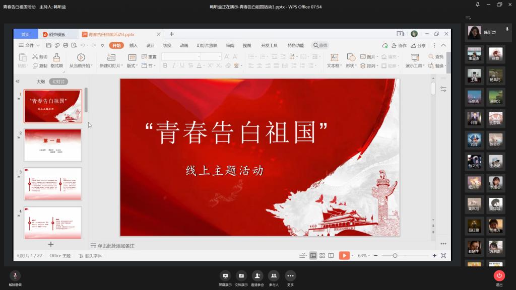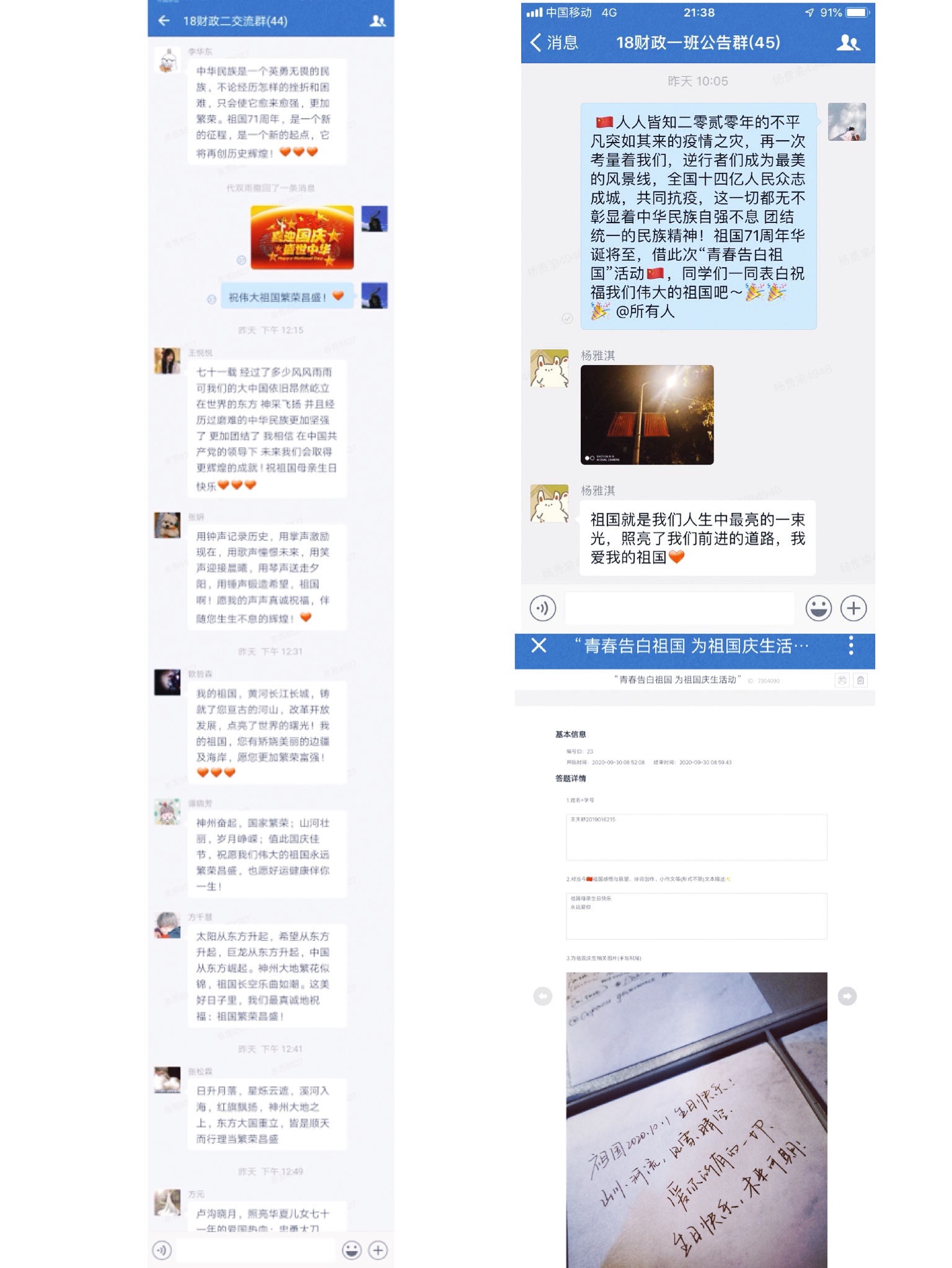自活动发起以来,各团支部有序组织进行活动,全学院含研究生支部共32个团支部参加了本次“青春告白祖国”活动。经院学子们不拘一格,用丰富多彩的方式向祖国献上诚挚的祝福。大多数的团支部都选择了一个固定的时间段,由各团支部成员分别在班级群中分享自己想要送给祖国71年华诞的祝福。在活动中,经院学子以青春之名告白祖国,他们将对祖国的祝福不只是表现在简短的文字中,还用心地捕捉到校园中的国庆色彩,将对祖国的祝福留在了纸上,用绘画或书法的形式展现出来。其中也有部分团支部别出心裁,直接采用召开线上会议的方式,用PPT将文字、图片、视频结合起来,让同学们在朗诵诗文、展示祖国靓丽风景的过程中,一表爱国之情。