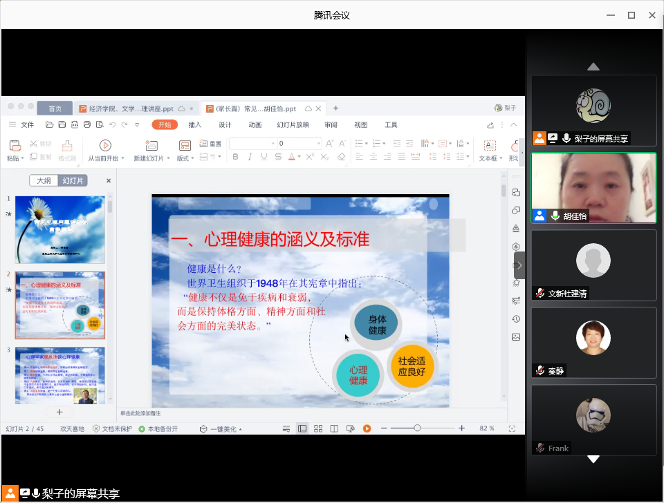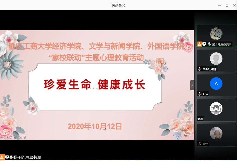 为加强家校联系,共同维护学生心理健康,2020年10月12日晚19:00,太阳成集团tyc122cc、文学与新闻学院和外国语学院共同举办“珍爱生命·健康成长”家校联动心理教育线上主题活动。活动邀请了122cc太阳集成游戏大学生心理健康教育与咨询中心副主任,国家二级心理咨询师胡佳怡老师作心理专题讲座,、太阳成集团tyc122cc分党委副书记、副院长王燕教授,文新学院分党委副书记程元元、外语学院分党委副书记吴欢欢及部分学生家长共同参加了此次活动。