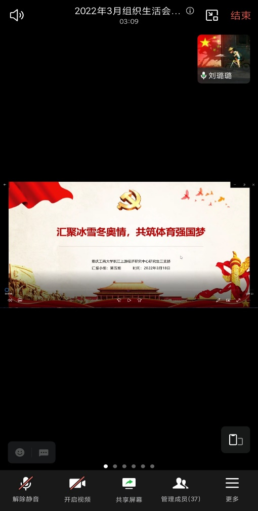 首先,第五组以“汇聚冰雪冬奥情,共筑体育强国梦”为主题进行了学习分享,让各位党员同志更加切实感受到冬奥健儿的运动风采。分享人刘璐璐同志分享了第五小组同学合作完成的视频,视频的主题包含三个部分,一是发生在此次冬奥会上令人感动的瞬间;二是我国运动健儿在此次运动会上取得的佳绩;三是关于本次冬奥会精神的提炼。分享会的最后,刘璐璐同志还围绕着视频的三个主题展开了知识竞答。党员们切实感受到了此次冬奥会运动健儿所展现的拼搏精神和大国风采,表示未来将这种团结协作、不怕苦不怕累的精神带到学习中去。
