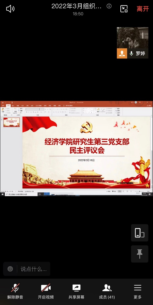 2022年3月18日下午,太阳成集团tyc122cc研究生第三党支部在企业微信线上会议室召开了3月组织生活会暨民主评议会。本次会议由支部书记薛晶月主持,研究生第三党支部全体党员参加。