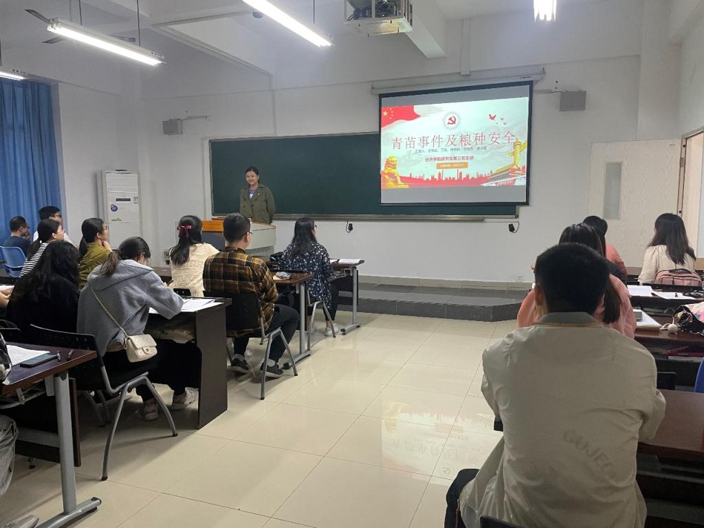首先,薛晶月同志针对青苗事件进行了回顾,展开了一节别开生面的党课学习,透过现象挖掘本质,对此次事件进行了深刻解读。在此基础上,第四组分享人曾小晏同志向大家详细介绍了我们国家的粮食安全级别,以及粮食安全的三道防线:包括粮食储备制度、乙醇汽油技术以及袁隆平杂交水稻。接着由李玉凤、杨艳林、李杨杰等其他组员同志阐述了中国的种子安全,分别从国内现状、贸易特征、应对方法及习近平总书记关于中国粮种安全的重要讲话等,呼吁所有党员在粮食安全问题上不能有丝毫麻痹大意。最后,与会党员丁瑞同志总结了青苗事件及粮种安全对党员的启示,倡导大家节约粮食、关注时事,保持初心,不妄加评论和转发网络热门事件。